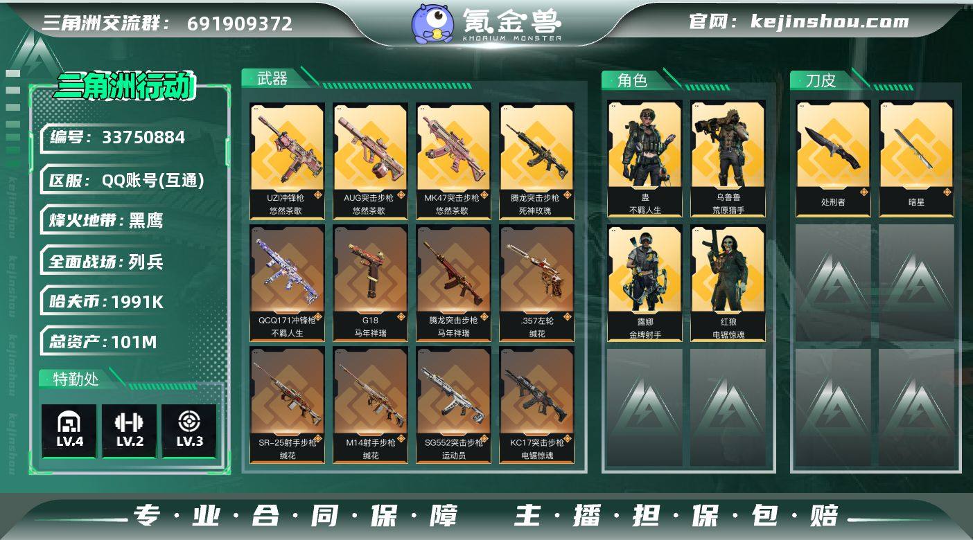 【960526】101m总资产-1991k哈夫币-60烽火等级-黑鹰-14战场等级-列兵 【干员外观】:红狼-电锯惊魂,露娜-金牌射手,乌鲁鲁-荒原猎手,蛊-不羁人生 【近战皮肤】:近战-暗星,近战-处刑者1级,近战-黑鹰 【传说外观】:M4A1突击步枪-阿米娅,M16A4突击步枪-狩猎时刻,AUG突击步枪-悠然茶歇,SG552突击步枪-运动员,SCAR-H战斗步枪-启航,G3战斗步枪-狩猎时刻,CAR-15突击步枪-阿米娅,腾龙突击步枪-捞点薯条,腾龙突击步枪-死神玫瑰,腾龙突击步枪-马年祥瑞,KC17突击步枪-电锯惊魂,MK47突击步枪-悠然茶歇,Vector冲锋枪-狩猎时刻,UZI冲锋枪-悠然茶歇,勇士冲锋枪-能天使-午夜邮差,QCQ171冲锋枪-不羁人生,M14射手步枪-蛮荒,M14射手步枪-缄花,SR-25射手步枪-缄花,AWM狙击步枪-捞点薯条,.357左轮-缄花,G18-马年祥瑞,93R-捞点薯条,复合弓-黑·天际线 【史诗外观】:AKM突击步枪-林中猎手,QBZ95-1突击步枪-曙光,K416突击步枪-腊梅,K416突击步枪-阿萨拉特攻,M16A4突击步枪-竞赛选手,AUG突击步枪-蝮蛇,M7战斗步枪-百步穿杨,SG552突击步枪-深海恐惧,SG552突击步枪-哈夫克警备,G3战斗步枪-流沙送葬,G3战斗步枪-哈夫克警备,AS Val突击步枪-百步穿杨,腾龙突击步枪...