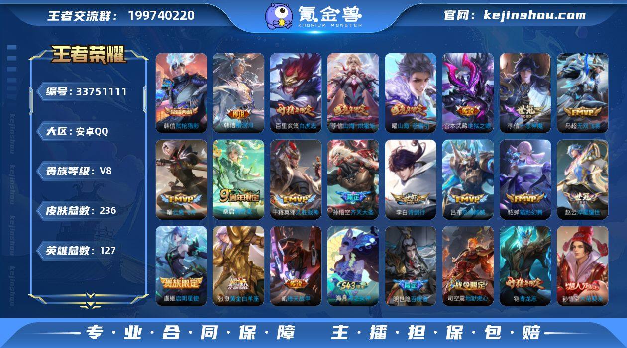 【王者荣耀】珍品无双0 典藏1 无双0 珍品传说0 传说20 史诗57 英雄127 皮肤236 贵族8级 荣耀典藏:弑枪猎影__传说皮肤:鸣野蒿|无双飞将|绛天战甲|启明星使|地狱之眼|久胜战神|黄金白羊座|猫影幻舞|一念神魔|云鹰飞将|淬星耀世|齐天大圣|白虎志|怒海麟威|诗剑行|战鼓燎原|逐花归海|山海·苍雷引|山海·炽霜斩|踏浪归__稀有限定:青龙志|大圣娶亲|蔷薇恋人|傲雪梅枪|百里守约-真我赫兹|大漠名商|地狱燃心|古海寻踪|海滩派对|海盐诗旅|皇家上将|混沌棋|剑破天穹|江河有灵|金庭之子|魔术师|匿光侦查者|奇幻香踪|擒涛扼浪|驱傩正仪|沙漠行僧|探海日志|醍醐杖|天穹祈灯|无心|五谷丰年|疑决卦|阴阳师|银河之约|暗隐猎兽者|冰雪圆舞曲|德古拉伯爵|地狱岩魂|电玩·爆裂旋风|功夫厨神|鬼剑武藏|节奏热浪|金属风暴|李元芳-蔬乡物语|吕布-末日机甲|魅力维加斯|女仆咖啡|青蛇|热力回旋|赏金猎手|圣诞狂欢|圣诞恋歌|鲁班七号-蔬乡物语|水果甜心|孙策-猫狗日记|赵云-未来纪元|闲日渔趣|摇滚巨星|鹰眼统帅|幽灵船长|逐浪之夏|紫霞仙子|百里守约-百相守梦|老夫子-百相守梦|星界特工|噬灭天穹|敬我三分|撼地雄心|破空之剑|顽岩魄|蔡文姬-夏日便利店|虞姬-夏日便利店|天穹之誓|曙光守护者|心灵战警|千...