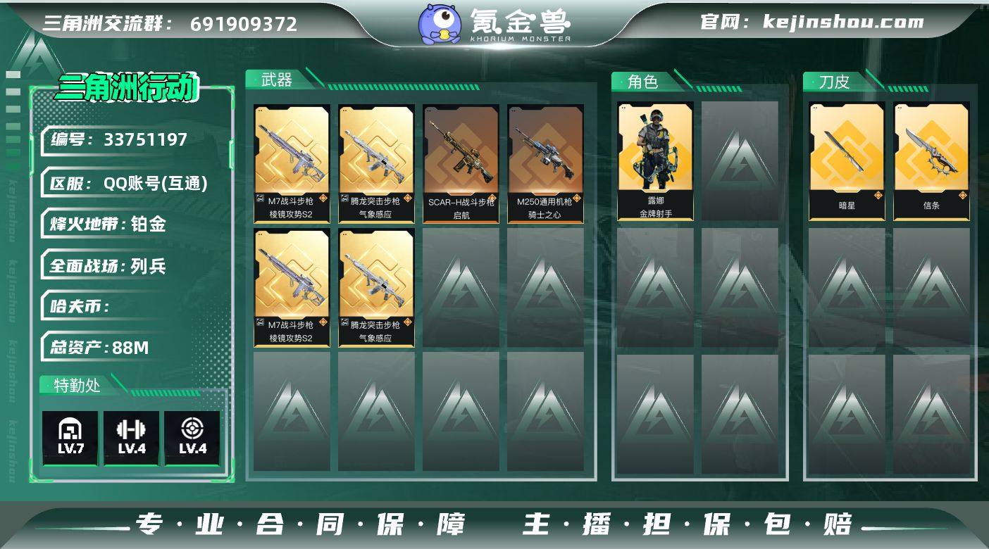 [19006468]总资产:88.7M 1干员外观 2近战传说 12传说枪械 哈夫币:20.284K 不可二次 高级安全箱(2×3)4.11号到期 不可修改实名 【烽火地带段位】铂金 【全面战场段位】列兵 【干员外观】露娜-金牌射手(S7) 【传说武器皮肤】近战武器-暗星,近战-信条,M7战斗步枪-棱镜攻势S2(典藏),腾龙突击步枪-气象感应(典藏),M250通用机枪-骑士之心,SG552突击步枪-运动员,P90冲锋枪-信条,47突击步枪-暗星,SR-25射手步枪-信条,SCAR-H战斗步枪-启航,G3战斗步枪-骑士,KC17突击步枪-电锯惊魂 【史诗武器皮肤】ASh-12战斗步枪-无极限,G3战斗步枪-流沙送葬,AWM狙击步枪-流沙送葬
