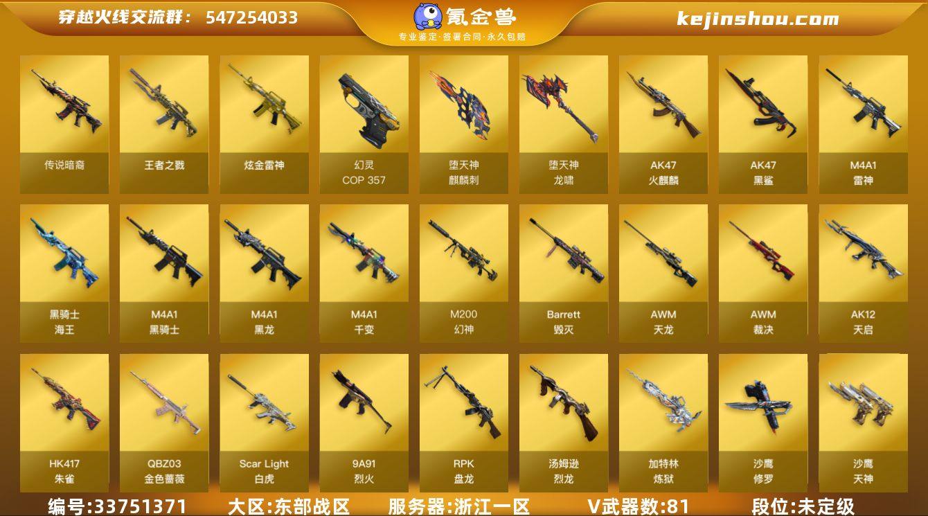 浙江一区-99V-20王者武器数-1炫金武器数 【传说武器】:传说暗裔 【热门武器】:传说暗裔,QBZ03-金色蔷薇,Scar Light-白虎,HK417-朱雀,M200-幻神,荣耀世冠-雷神,荣耀世冠-柯尔特,M4A1-黑骑士,汤姆逊-烈龙*6,RPK-盘龙*6,加特林-炼狱,COP 357-幻灵,沙鹰-修罗*3,荣耀世冠-龙啸,金刚伞 【王者炫金武器】:王者之戮,炫金雷神,王者之魄高爆手雷,王者之魄闪光弹 【音效卡】:M200-幻神音效卡,AK47-火麒麟音效卡,M4A1-黑骑士音效卡*2,Barrett-毁灭音效卡,QBZ03-金色蔷薇音效卡,Barrett-碧霄极光音效卡 【皮肤】:幻神-冠军之幻,白虎-霓虹机甲 皮肤,雷神-荣耀之魄,火麒麟-冠军之心,火麒麟-平天大圣,毁灭耀金皮肤,毁灭-星空,黑龙-能量核心,黑骑士-冠军之势,黑骑士-战神马超,战神-粉色甜心皮肤*13,战神-紫绶金章皮肤*35,战神-流金岁月皮肤*29,修罗-能量核心,屠龙-荣耀之锋 【角色】:樱,魅影,影豹,零·纪元,王者-葵-貂蝉,王者-魅影,乔伊教练,空,暗夜-X,电竞少女,风暴女,零-水下丽影,灵狐者-黄金海岸,灵狐者-职业经理,潜龙队-X,斯沃特-X,蜀雪,铁骑荣耀,王者-零-传说之路,五号兵器-赛博朋克,幽 【人偶武器】:火麒麟-灵狐,迷你牛...