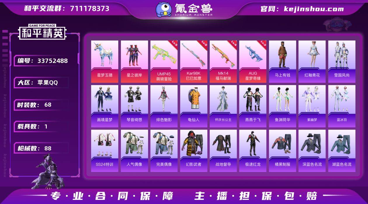 【960550】苹果 手Q-1粉装-4特效枪-1载具-1粉色飞行器-23862热力值-3王牌印记-68套装-88枪皮QW2642105 【热门品类】:套装-龟仙人 【粉色套装】:粉装-星之彼岸 【粉色枪皮等级】:AUG-星梦奇缘(三级),UMP45-萌骑冒险(五级),Kar98K-巳巳如意(五级),Mk14-福马献瑞(四级) 【粉色载具】:星梦玉骢 【粉色枪皮】:AUG-星梦奇缘,UMP45-萌骑冒险,Kar98K-巳巳如意,Mk14-福马献瑞 【粉色飞行器】:炫彩糖果飞行器 【粉色降落伞】:绝对恒星降落伞,星梦奇缘降落伞,雪月幻音降落伞,极意拳锋降落伞,炫彩糖果降落伞,虹云熊熊降落伞 【稀有套装】:套装-龟仙人,套装-雪国风尚,套装-炫彩糖果,套装-马上有钱,角色-怀庆长公主,套装-燕燕于飞,套装-鱼渊荷华,套装-紫幽梦,套装-蓝冰羽,角色-绯色魅影,套装-画境星梦,套装-琴音绮想,套装-雨过天青,套装-红釉青花 【稀有枪皮】:AUG-冰晶雪宝,AKM-破晓战魂,M16A4-幻世战舞者,SCAR-L-炫彩节奏,SCAR-L-红色方程式,M416-红色方程式,M416-蓝色火焰,AUG-天降萌叽,AUG-耀粉歌者,ACE32-画境星梦,UZI-天降萌叽,UZI-影袭,UZI-红色方程式,UMP45-蓝色火焰,汤姆逊-耀粉歌者,汤姆逊-像素花束,MP5K-画境星梦,AKS-74U-鬼...