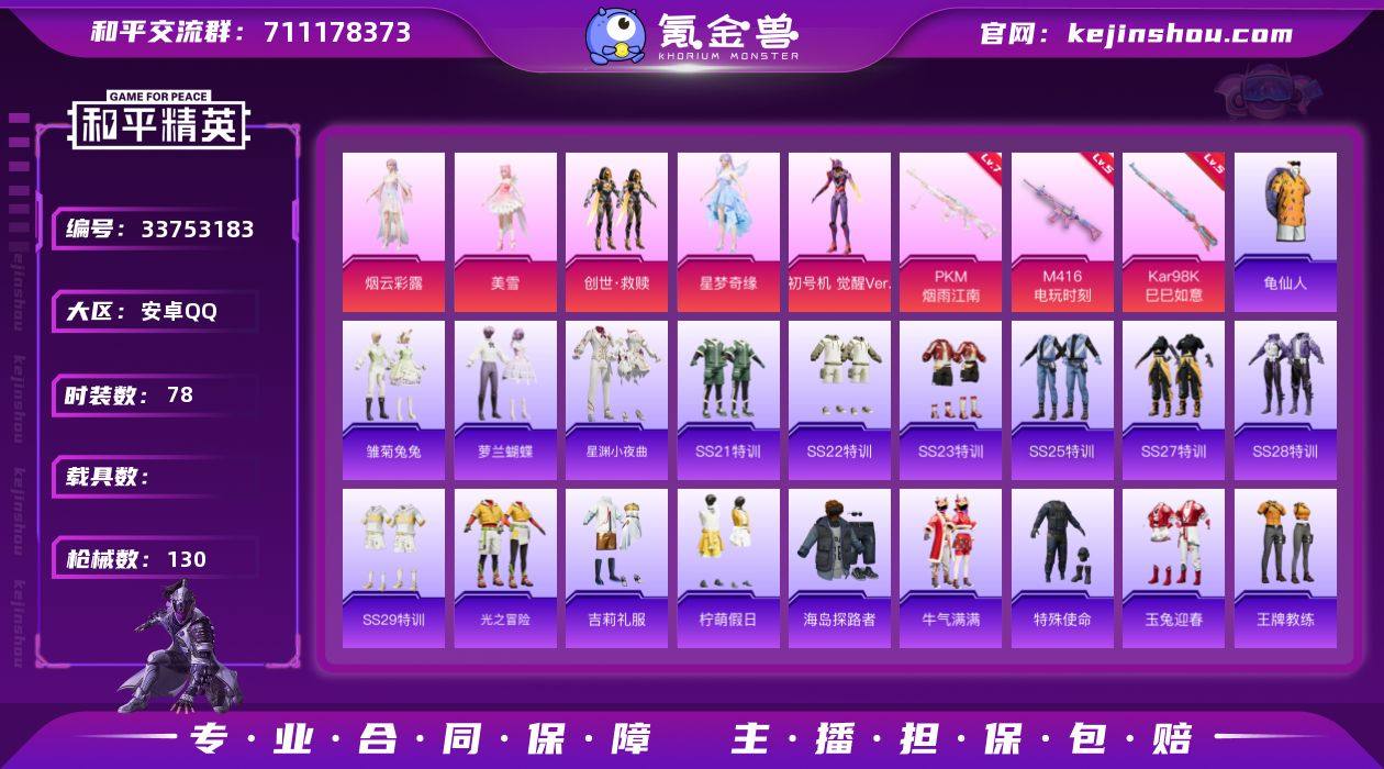 78套装/枪械3/装备131/战备87/王牌印记7/热力值37524/五级M416-电玩时刻/五级Kar98K-巳巳如意/七级PKM-江南烟雨/龟仙人/烟云彩露/美雪/创世·救赎/星梦奇缘/初号机 觉醒Ver./M416电玩时刻/Kar98K-巳巳如意/PKM江南烟雨/炫彩糖果飞行器/天之羽翼降落伞/垂柳戏鸭降落伞/蜜语绒猫降落伞/江南烟雨降落伞/巴啦啦小魔仙降落伞/精灵梦叶罗丽降落伞/金丰海韵降落伞/时空协奏降落伞/樱桃泡泡降落伞/炫彩糖果降落伞/雏菊兔兔/萝兰蝴蝶/星渊小夜曲/AKM-江南烟雨/AKM-破晓战魂/AKM-龙的传人/M16A4-幻世战舞者/M16A4-红色方程式/M16A4-蓝色火焰/SCAR-L-炫彩节奏/SCAR-L-玉兔迎春/SCAR-L-红色方程式/M416-糯团青竹/M416-红色方程式/M416-蓝色火焰/GROZA-田园牧歌/AUG-天降萌叽/AUG-耀粉歌者/QBZ-彩虹符号/M762-天降萌叽/M762-第五大道/Mk47-洛神天依/G36C-金风玉露/AC-VAL-天降萌叽/蜜獾-天降萌叽/蜜獾-娇憨猪猪/UZI-啾咪啾咪/UZI-天降萌叽/UZI-娇憨猪猪/UZI-红色方程式/UMP45-生命誓言/UMP45-蓝色火焰/Vector-焰鹰斗篷/Vector-生命誓言/Vector-田园牧歌/汤姆逊-天降萌叽/汤姆逊-炫彩节奏/汤姆逊-耀粉歌者/汤姆逊-樱桃泡泡/Kar98K-红色方程式/M24-歌者泠鸢/AWM-焰鹰斗篷/SKS-炫彩节奏/VSS-田...