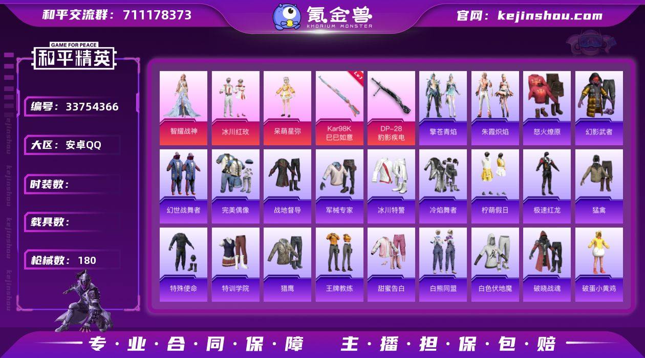 05-【可二次】【因赛季更新游戏段付以上号为准!】 安卓Q-4粉装4特效枪2热门155套装180枪皮 4印记 历史超级王牌4星 【4粉装】 异瞳寒姬 呆萌星弥 智耀战神 冰川红玫 【4特效枪】 Kar98K-巳巳如意 (5级) DP-28-豹影疾电 (5级) Mk14-福马献瑞 (5级) UMP45-萌骑冒险 (4级) 【2热门】 破蛋小黄鸡 极速红龙