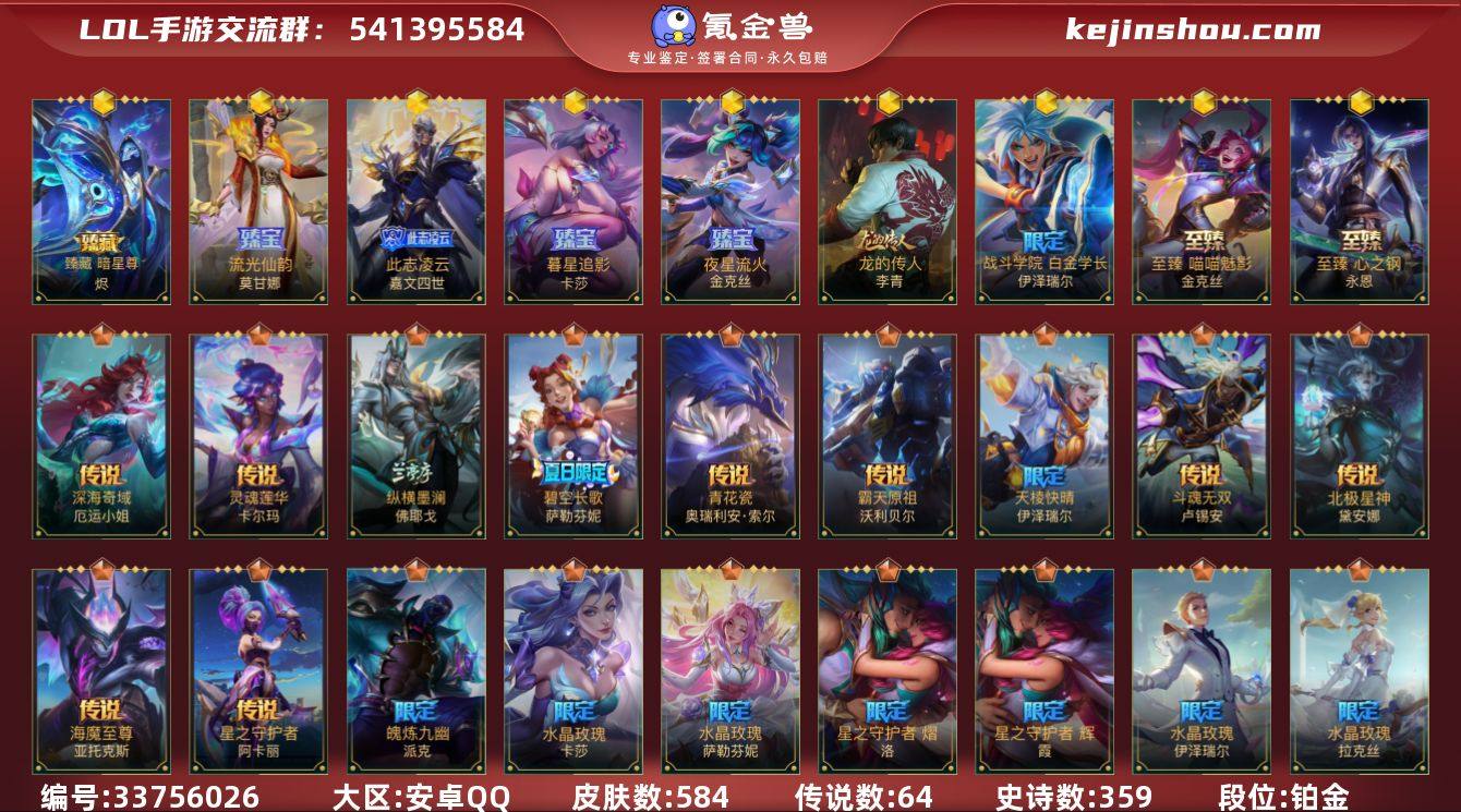 实名: 可修改 段位: 铂金 皮肤数: 584 神话皮: 战斗学院EZ白金学长,至臻喵喵魅影金克丝,至臻心之钢永恩,龙的传人,夜星流火 金克丝,暮星追影 卡莎,此志凌云 嘉文四世,流光仙韵 莫甘娜,臻藏 暗星尊 烬 限定皮肤: 龙的传人,水晶玫瑰拉克丝,水晶玫瑰伊泽瑞尔,水晶玫瑰阿卡丽,水晶玫瑰永恩,水晶玫瑰蔚,水晶玫瑰皇子,水晶玫瑰琴女,水晶玫瑰锐雯,涂鸦小队艾克,吕布奉先,关羽云长,张辽文远,赵云子龙,闭月之颜貂蝉,地底世界卡牌,钢铁军团拉克丝,星之守护者霞,星之守护者洛,虎痴之拳 传说皮: 暗星尊,地狱之门卫士,福牛守护者女枪,灌篮高手,黑夜使者亚索,黎明使者锐雯,律政大亨,女主播风女,欧米伽小队 幽灵特工,日蚀骑士蕾欧娜,水晶玫瑰阿卡丽,神龙尊者 驭风啸龙,神王盖伦,神王诺手,水晶玫瑰拉克丝,水晶玫瑰EZ,天煞劫,西部魔影卢锡安,西部天使寒冰,西部天使赛娜,星域游侠卡牌,星之守护者金克丝,星之守护者阿狸,星之守护者 落,星之守护者 陨,源计划:净化,源计划:联合,灵魂莲华锤石,黎明使者永恩,源计划:林,源计划:泯灭,暗星女王拉克丝,最终BOSS维迦,光明哨兵格雷福斯,斗魂无双亚索,星域武神贾克斯,星之守护者卡莎,灵魂莲华阿狸,灵魂莲华腕豪,心之钢凯隐,水晶玫瑰萨勒芬妮,魔女伊芙琳,...