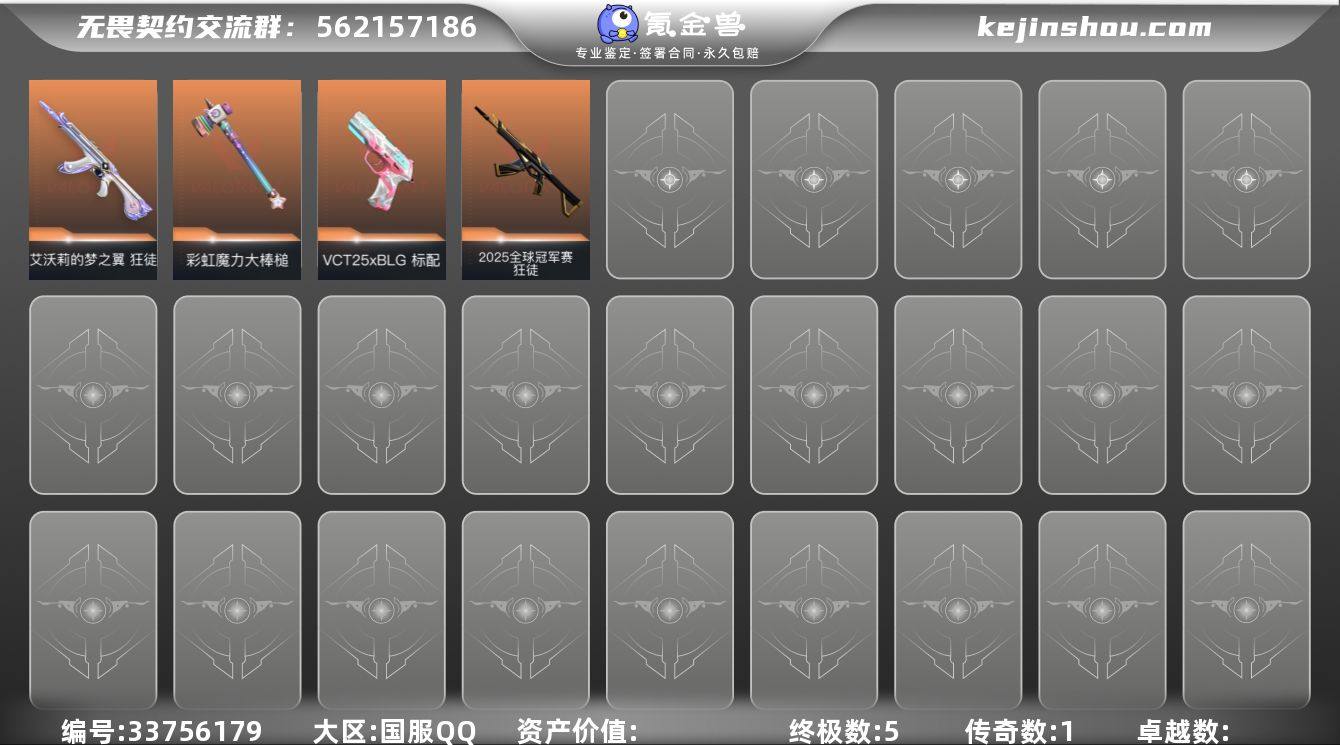 【kywwqy113】【英雄】:炼狱,维斯,暮蝶,壹决,铁臂,捷风,雷兹,不死鸟,贤者,猎枭,蝰蛇,芮娜,奇乐,尚勃勒,霓虹,斯凯,夜露,海神,盖可,黑梦 【近战武器】:近战武器-影钩,近战武器-彩虹魔力大棒槌 【狂徒】:狂徒-2025全球冠军赛,狂徒-艾沃莉的梦之翼 【骇灵】:骇灵-无限竞技 【VCT手枪】:标配-VCT25 x BLG 【卡面】:热舞环节 卡面,红鳞松叶 卡面,Clutch 卡面,无畏契约GO!第一卷:芮娜 卡面,无畏契约GO!第一卷:零 卡面,无垠星环 卡面,《双城之战》金克丝 卡面,天台狂欢 卡面,代号红色 卡面,新兵报到 卡面,V契约 卡面,无畏契约 卡面 【喷漆】:买装还是存钱 喷漆,酷熊冲浪 喷漆,松叶 喷漆,无畏契约GO!第一卷:奇乐 喷漆,胜利属于无畏契约 喷漆,GLHF 喷漆,无畏契约 喷漆 【挂饰】:无畏契约GO!第一卷 零 挂饰,天外飞客 挂饰,《双城之战》魄罗 挂饰,海豹的认可 挂饰,无畏契约 纪念币 挂饰