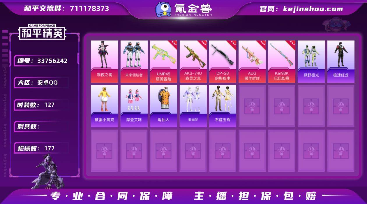 DYH18016【地铁满天赋 可二次 2粉装-6特效枪 罪夜之冕 AUG-暖羊咩咩满级 小丑鱼】安卓手Q-2粉装-6特效枪-127套装-177枪皮-5王牌印记-传奇王牌7星-49013热力值【2粉装】未来领航者,角色-罪夜之冕【6特效枪】AKS-74U-森灵之息[4级],UMP45-萌骑冒险[3级],Kar98K-巳巳如意[5级],DP-28-豹影疾电[5级],Mk14-福马献瑞[5级],AUG-暖羊咩咩[5级]【2稀有】小丑鱼,AKM-缤纷海域【9飞行器】马上有福飞行器,鸡智如我飞行器,登顶巅峰飞行器,梦幻火箭飞行器,狂鲨锋刃飞行器,炫彩糖果飞行器,顶峰精英尾迹,异域银装飞行器,破刃行动尾迹【2头盔】梦幻火箭头盔,深海小丑鱼头盔【1背包】梦幻火箭背包【294其它衣服和枪皮】鹤鸣,红釉青花,竞技达人朋克,白色伏地魔,阳光菠萝,耀粉歌者,龙的传人,战术大师,竞技名士,街头潮人,柠萌假日,萌鸡速递,人气偶像,燃烧卡路里,先驱飞行员,SS28特训,雪国风尚,街头风暴,妙红点点,书海巡游,跃动晴空,都市漫游者,完美偶像,幻影武者,SS25特训,黄色名流,角色-月烬之祷,燕燕于飞,绿野极光,香桃花海,暗黑骑手,SS37特训,福马献瑞,黄色伏地魔,云魄琉璃,橘黑制服,红色运动,角色-紫俏灵猫,SS33特训,极速红龙,琴音绮想,春日漫步,战地督导,破蛋小黄鸡,星途旅人,绮丽涂鸦,旭日情...