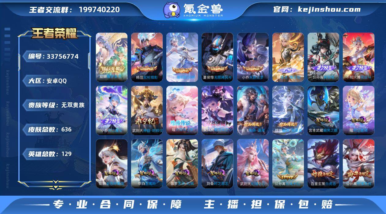 ·全皮马超·全皮澜·全皮露娜·全皮不知火舞·天骥开鸿天幕·凤鸣九霄天幕·馥梦繁花·6典藏·1珍品无双·7无双·5珍品·114传说·8星传说·时之愿境·47按键·154个性戳戳·2.2W亲昵度灵宝糖糖·可二次】w22934-安卓Q-129英雄-636皮肤-22王者印记-300铭文-贵族积分36w【无双贵族10】【6典藏·1珍品无双·7无双·5珍品·8星传说·114传说·3天幕·47按键·154个性戳戳】【因赛季更新游戏段付以上号为准!】 【英雄全皮】:墨子全皮,刘禅全皮,露娜全皮,刘邦全皮,孙权全皮,不知火舞全皮,朵莉亚全皮,娜可露露全皮,橘右京全皮,太乙真人全皮,鬼谷子全皮,苏烈全皮,百里玄策全皮,沈梦溪全皮,狂铁全皮,李信全皮,伽罗全皮,嫦娥全皮,马超全皮,敖隐全皮,蒙犽全皮,鲁班大师全皮,蒙恬全皮,澜全皮,阿古朵全皮,夏洛特全皮,司空震全皮,赵怀真全皮,莱西奥全皮,戈娅全皮,空空儿全皮,影全皮,海诺全皮,少司缘全皮 【荣耀典藏】:武则天英雄,夏侯惇无限飓风号,小乔天鹅之梦,韩信弑枪猎影,伽罗最初的交响,安琪拉颠倒童话魔镜 【珍品无双】:貂蝉馥梦繁花 【无双皮肤】:李信问心剑,孙悟空无相,曜器灵螭龙剑,公孙离离恨烟,不知火舞花合斗,小乔时之魔女,武则天神器明辉仪 【珍品传说...