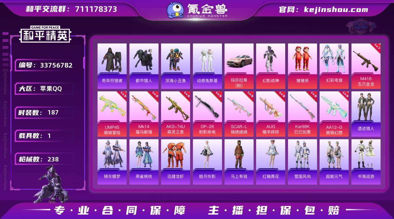187套装/枪械9/装备290/载具1/战备155/王牌印记13/热力值69328/五级SCAR-L-锦绣绵绵/七级M416-五爪金龙/五级AUG-暖羊咩咩/五级UMP45-萌骑冒险/五级AKS-74U-森灵之息/五级Kar98K-巳巳如意/五级MK14-福马献瑞/四级AA12-G-萌骑幻想/五级DP-28-豹影疾电/浪漫天命/都市猎人/深海小丑鱼/小丑鱼/奇异狩猎者/忍者信条/动感兔斯基/龟仙人/暗影哥特/Mark.06/熔岩游骑兵连帽夹克/幻影战神/猪猪侠/幻彩电音/玛莎拉蒂Ghibli(粉)/SCAR-L-锦绣绵绵/M416五爪金龙/AUG-暖羊咩咩/UMP45-萌骑冒险/AKS-74U-森灵之息/Kar98K-巳巳如意/MK14-福马献瑞/AA12-G-萌骑幻想/DP-28-豹影疾电/炫彩糖果飞行器/初号机 觉醒Ver.飞行器/英伦信使飞行器/戏水时光飞行器/绝对恒星降落伞/未来战士降落伞/仲夏莫吉托降落伞/精灵梦叶罗丽降落伞/忍者神龟降落伞/炫彩糖果降落伞/巳巳如意/超能元气/雪国风尚/炫彩糖果/马上有钱/迅捷龙虾/遗迹猎人/雏菊兔兔/萝兰蝴蝶/小熊娃娃/多纳泰罗/糖糖葫芦/青团波波/棉花软糖/都市丽猫/燕燕于飞/鱼渊荷华/风舞幻音/粉恋花/紫幽梦/蓝冰羽/星影赞美诗/霓虹热舞/彩虹兔/云朵鹅/雪绒豹/朱霞炽焰/凌霄紫焰/擎苍青焰/申公豹/书海巡游/画境星梦/琴音绮想/雨过天青/红釉青花/皓月伶影/锦灰...