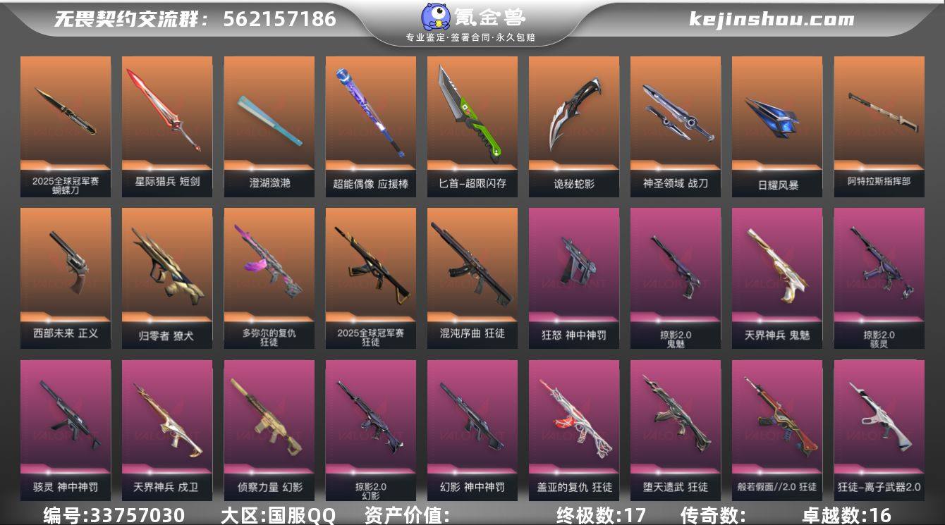 【套装】:2025全球冠军赛套装,掠影//2.0套装,神中神罚套装 【英雄】:幻棱,炼狱,维斯,暮蝶,钛狐,壹决,铁臂,捷风,雷兹,幽影,不死鸟,贤者,猎枭,蝰蛇,零,芮娜,奇乐,尚勃勒,霓虹,斯凯,夜露,星礈,K/O,海神,盖可,黑梦,钢锁 【近战武器】:近战武器-2025全球冠军赛 蝴蝶刀,近战武器-影钩,近战武器-神之刃,近战武器-澄湖潋滟,近战武器-夜之蝴蝶,近战武器-超能偶像 应援棒,近战武器-超限闪存 匕首,近战武器-诡秘蛇影 军刀,近战武器-神圣领域 战刀,近战武器-日耀风暴 遗器,近战武器-阿特拉斯指挥部 甩棍,近战武器-星际猎兵 短剑 【狂徒】:狂徒-2025全球冠军赛,狂徒-混沌序曲,狂徒-多弥尔的复仇,狂徒-般若假面//2.0,狂徒-堕天遗武,狂徒-盖亚的复仇,狂徒-离子武器//2.0,狂徒-超能偶像,狂徒-永恒之砂,狂徒-诡秘蛇影 【幻影】:幻影-侦察力量,幻影-神中神罚,幻影-掠影//2.0,幻影-超限闪存,幻影-巨神铁甲,幻影-神圣领域,幻影-聚合之力,幻影-末日之翼 【戍卫】:戍卫-天界神兵,戍卫-超能偶像,戍卫-浮光跃金,戍卫-月球哨兵,戍卫-折光棱晶 【獠犬】:獠犬-归零者,獠犬-神圣领域,獠犬-采蜜小蜂队,獠犬-模拟赫兹 【冥驹】:冥驹-...