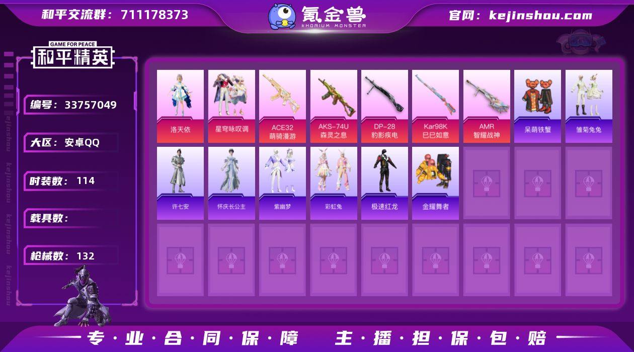 【960663】DYH18021【地铁漫天赋2粉装-6特效枪角色-洛天依】安卓手Q-2粉装-6特效枪-114套装-132枪皮-9王牌印记-超级王牌5星-39418热力值【2粉装】角色-洛天依,星穹咏叹调【6特效枪】Mk14-福马献瑞[5级],DP-28-豹影疾电[5级],ACE32-萌骑漫游[2级],AMR-智耀战神[7级],Kar98K-巳巳如意[5级],AKS-74U-森灵之息[5级]【1稀有】AKM-奇异狩猎者【9飞行器】牡丹亭・游园飞行器,动力核心飞行器,顶峰精英尾迹,破刃行动尾迹,狂鲨锋刃飞行器,时光之誓飞行器,异域银装飞行器,马上有福飞行器,时光之吻飞行器【237其它衣服和枪皮】人气偶像,星途旅人,星影赞美诗,长空猛禽,凌霄紫焰,湖蓝色名流,青年教官,都市魅力,滨海厨神,云魄琉璃,黄色伏地魔,黑色伏地魔,玩偶服-懒羊羊,顶瓜瓜,SS34特训,缤纷果语,蝶变,破晓战魂,角色-蜜桃派对,幻影武者,街头潮人,擎苍青焰,棋盘冕主,紫幽梦,特训学院,马上有钱,灼焰舞者,雏菊兔兔,战术大师,旭日情侣,雨过天青,SS37特训,特战装甲,猛禽,萝兰蝴蝶,黄色名流,白糯汤圆,粉恋花,云朵鹅,战地督导,玩偶服-美羊羊,猎鹰,橘黑制服,街头风暴,深蓝色名流,鱼渊荷华,薄荷星砂,SS36特训,森林游猎者,SS32特训,青翼流星,幻世战舞者,白色伏地魔,竞技达人朋克,小熊娃娃,SS35特训,潮流...