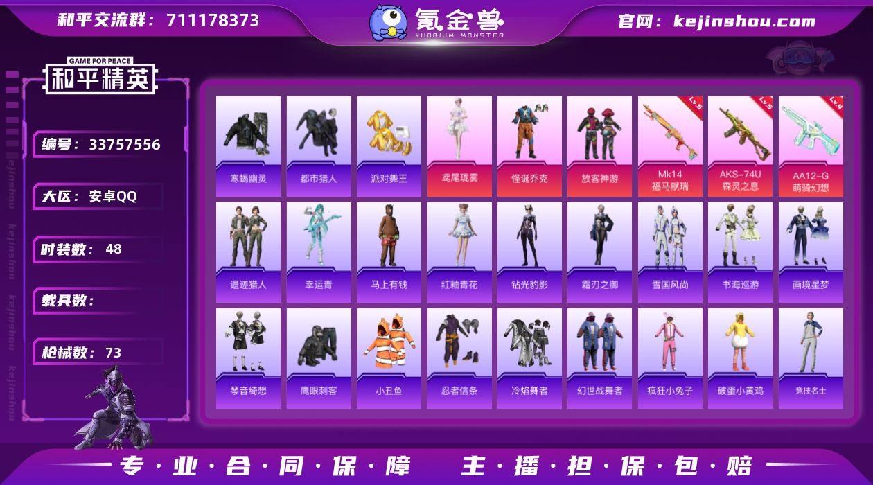 48套装/枪械3/装备105/战备60/王牌印记4/热力值22178/五级AKS-74U-森灵之息/五级MK14-福马献瑞/四级AA12-G-萌骑幻想/怪诞乔克/寒蝎幽灵/都市猎人/派对舞王/小丑鱼/忍者信条/放客神游/鸢尾珑雾/AKS-74U-森灵之息/MK14-福马献瑞/AA12-G-萌骑幻想/炫彩糖果飞行器/极意拳锋飞行器/幻影战神降落伞/炫彩糖果降落伞/罪夜之冕降落伞/霜月狼主降落伞/雪国风尚/炫彩糖果/幸运青/马上有钱/遗迹猎人/书海巡游/画境星梦/琴音绮想/霜刃之御/钻光豹影/雨过天青/红釉青花/AUG-冰晶雪宝/AKM-影袭/AKM-破晓战魂/SCAR-L-炫彩节奏/SCAR-L-绶带小兔/M416-红色方程式/GROZA-影袭/GROZA-暮色玫影/AUG-幻影战神/AUG-甜蜜菠萝/M762-登顶巅峰/ACE32-画境星梦/UZI-啾咪啾咪/UZI-影袭/UMP45-夜灯/汤姆逊-天降萌叽/汤姆逊-绒绒猫尾/汤姆逊-像素花束/MP5K-画境星梦/Kar98K-幻影战神/Kar98K-影袭/M24-影袭/M24-炫彩节奏/SKS-炫彩节奏/MK20-H-绶带小兔/M1加兰德-画境星梦/S12K-幻影战神/AA12-G-画境星梦/M249-彩虹符号/M249-星之彼岸/M249-绒绒猫尾/MG3-幻世战舞者/平底锅-画境星梦/冷焰舞者/幻世战舞者/疯狂小兔子/破蛋小黄鸡/竞技名士/街头潮人/长空猛禽/阳光火鸡/黑色伏地魔/龙的传人/鹰眼刺客/冰冻风暴/漫...