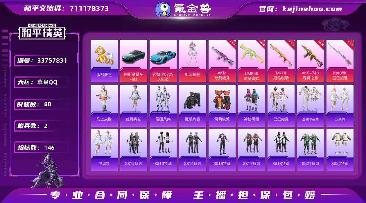 【AZH3447】苹果 手Q【虹云熊熊金靴子 满级炫紫旋律AKM 2载具】1粉装-5特效枪-2载具-2粉色飞行器-45615热力值-7王牌印记-88套装-146枪皮 【热门品类】:套装-派对舞王 【粉色套装】:角色-虹云熊熊 【粉色枪皮等级】:AKM-炫紫旋律(七级),UMP45-萌骑冒险(五级),AKS-74U-森灵之息(五级),Kar98K-巳巳如意(五级),Mk14-福马献瑞(五级) 【粉色载具】:阿斯顿马丁DBS(绿),迈凯伦570S(天际蓝) 【粉色枪皮】:AKM-炫紫旋律,UMP45-萌骑冒险,AKS-74U-森灵之息,Kar98K-巳巳如意,Mk14-福马献瑞 【粉色飞行器】:时光之吻飞行器,光之祷告飞行器 【粉色降落伞】:流星咚咚降落伞,彩虹甜喵降落伞,沙丘之主降落伞,月影灵韵降落伞,圣斗士星矢降落伞,星穹咏叹调降落伞 【稀有套装】:套装-巳巳如意,套装-雪国风尚,套装-马上来财,套装-星渊小夜曲,套装-云朵鹅,套装-雪绒豹,套装-雨过天青,套装-红釉青花 【稀有枪皮】:AKM-夜灯,AKM-奇异狩猎者,AKM-彩虹符号,AKM-缤纷海域,AKM-萌趣颜团子,AKM-龙的传人,M16A4-夜灯,SCAR-L-玉兔迎春,M416-糯团青竹,GROZA-异彩先驱,GROZA-影袭,GROZA-治愈之星,AUG-甜蜜菠萝,AUG-耀粉歌者,QBZ-原初圣火,QBZ-彩虹符号,M762-...