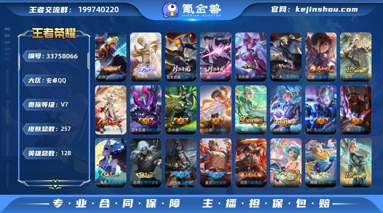 CHC40134,安卓Q-V7-至尊星耀II段位-128英雄-257皮肤-1典藏皮肤-1无双-2珍品传说-10传说-66史诗 【英雄全皮】:孙权全皮,苍全皮,敖隐全皮,影全皮 【荣耀典藏】:孙悟空全息碎影 【无双皮肤】:孙悟空无相 【珍品传说】:宫本武藏黑崎一护,暃朽木白哉 【传说皮肤】:云缨神骥越千峰,后羿神树通天,澜愿照九州拓,云缨幻光神枪,桑启鸣野蒿,云中君群星魔术团,铠绛天战甲,孙尚香末日机甲,宫本武藏地狱之眼,狄仁杰超时空战士 【限定皮肤】:白起狰,暃埋骨钱,姜子牙天穹之誓,杨戬破阵退雄兵,狄仁杰阴阳师,赵云皇家上将,芈月重明,周瑜赤莲之焰,夏侯惇朔风刀,典韦穷奇,狄仁杰魔术师,狄仁杰万华元夜,达摩沙漠行僧,项羽海滩派对,老夫子醍醐杖,程咬金演武夺筹,兰陵王金庭之子,孙悟空至尊宝,孙悟空孙行者,牛魔御旌,李元芳银河之约,李元芳云中旅人,钟馗驱傩正仪,雅典娜单词大作战,蔡文姬繁星吟游,太乙真人饕餮,鬼谷子原初探秘者,弈星混沌棋,梦奇顽趣,沈梦溪大漠名商,明世隐疑决卦,裴擒虎李小龙,裴擒虎擒涛扼浪,狂铁御狮,米莱狄御霄,米莱狄胡桃异想国,云中君纤云弄巧,上官婉儿梁祝,鲁班大师探海日志,桑启海盐诗旅,艾琳流音漫舞,张良古...
