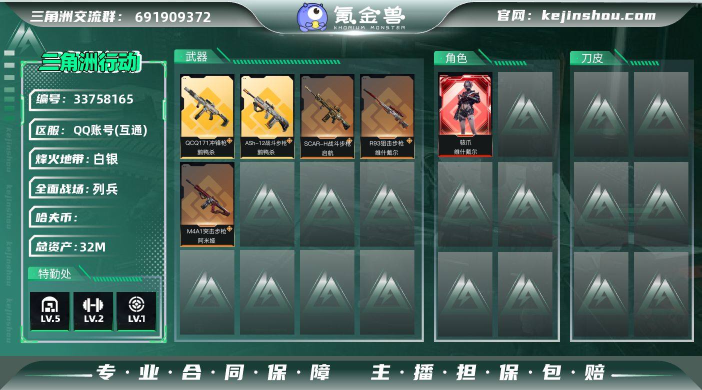 [19042576]总资产:32.3M 1干员外观 9传说枪械 哈夫币:3.229K 不可二次 不可修改实名 【烽火地带段位】白银 【全面战场段位】列兵 【干员外观】骇爪-维什戴尔 【传说武器皮肤】R93狙击步枪-维什戴尔,SCAR-H战斗步枪-启航,ASh-12战斗步枪-鹅鸭杀,QCQ171冲锋枪-鹅鸭杀,SR-25射手步枪-缄花,.357左轮-缄花,M14射手步枪-缄花,QBZ95-1突击步枪-凌霄戍卫,M4A1突击步枪-阿米娅