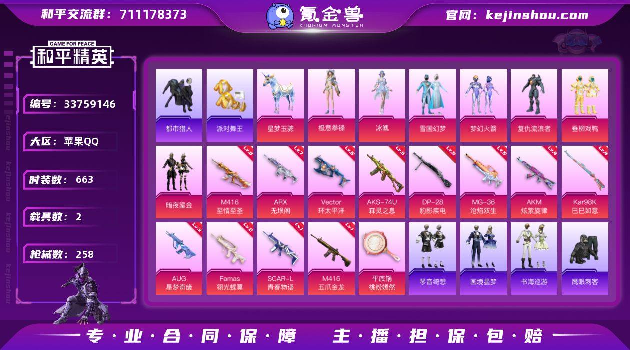 【特价出售】苹果Q-4稀有2载具9粉装16特效枪13热门181套装258枪皮 90310热力值 15印记 历史绝世王牌23星 【4稀有】 都市猎人 浪漫天命 派对舞王 派对舞王(金靴子) 【2载具】 仰望U7先锋版(阿盖尔紫) 星梦玉骢 【9粉装】 冰魄 梦幻火箭 雪国幻梦 月中灵 鸢尾珑雾 极意拳锋 垂柳戏鸭 暗夜鎏金 复仇流浪者 【16特效枪】 M416-五爪金龙 (1级) AKM-炫紫旋律 (5级) AKS-74U-森灵之息 (5级) Kar98K-巳巳如意 (4级) MG-36-沧焰双生 (5级) DP-28-鸢尾珑雾 (1级) DP-28-豹影疾电 (5级) AUG-星梦奇缘 (3级) ARX-无垠阁 (7级) M416-至情至圣 (9级) Mk14-福马献瑞 (5级) UMP45-萌骑冒险 (1级) ACE32-萌骑漫游 (3级) 平底锅-桃粉嫣然 (2级) Vector-环太平洋 (6级) SCAR-L-青春物语 (7级) 【13热门】 龟仙人 晶辉守护 鹰眼刺客 AG战队服 团圆交子 瑞龙福将 粉红小猪 漫步者 破蛋小黄鸡 军刀雅典娜 英勇保护者 AKM-奇异狩猎者 M762-瑞龙福将 【3飞行器】 梦幻火箭飞行器 星夜魔法师飞行翼 庄周梦蝶飞行器 【2头盔】 梦幻火箭头盔 雪国精灵头盔 【3背包】 梦幻火箭背包 雪国精灵背包 萌熊伴侣背包