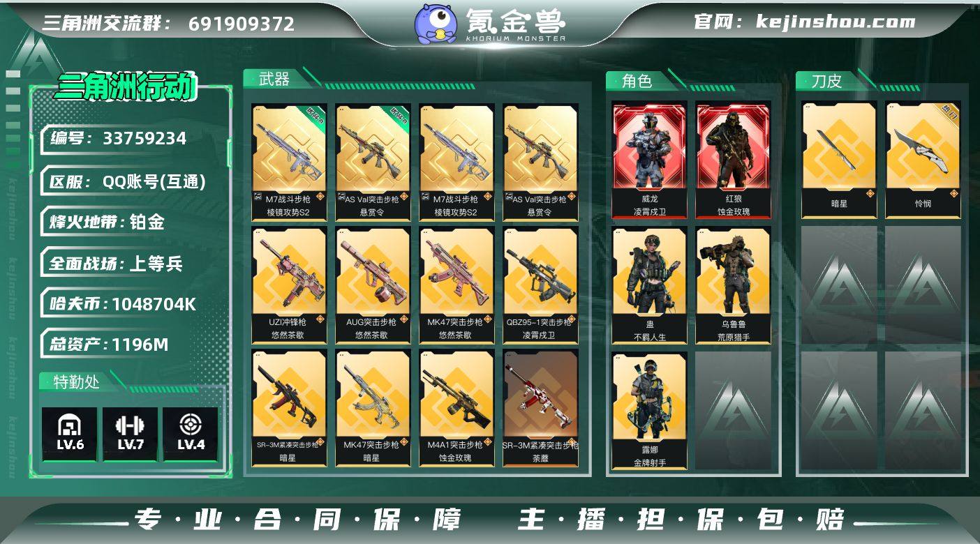 【960718】【8600三角券/高资产/红狼-蚀金玫瑰,威龙-凌霄戍卫/近战-暗星,近战-怜悯】1196m总资产-1048704k哈夫币-60烽火等级-铂金-32战场等级-上等兵 【干员外观】:红狼-蚀金玫瑰,威龙-凌霄戍卫,露娜-金牌射手,乌鲁鲁-荒原猎手,蛊-不羁人生 【近战皮肤】:近战-暗星,近战-怜悯,近战-处刑者3级,近战-黑鹰 【典藏外观】:M7战斗步枪-棱镜攻势S2,AS Val突击步枪-悬赏令 【典藏外观成色】:M7战斗步枪-棱镜攻势S2(优品A),AS Val突击步枪-悬赏令(优品A) 【传说外观】:M4A1突击步枪-蚀金玫瑰,AKM突击步枪-锦绣,QBZ95-1突击步枪-凌霄戍卫,AUG突击步枪-悠然茶歇,SG552突击步枪-运动员,SCAR-H战斗步枪-水墨云图,腾龙突击步枪-万金泪冠,K437突击步枪-锦绣,MK47突击步枪-悠然茶歇,MK47突击步枪-暗星,UZI冲锋枪-悠然茶歇,SMG-45冲锋枪-锦绣,SR-3M紧凑突击步枪-暗星,SR-3M紧凑突击步枪-荼蘼,勇士冲锋枪-万金泪冠,M14射手步枪-蛮荒,M14射手步枪-缄花,AWM狙击步枪-万金泪冠 【史诗外观】:K416突击步枪-冬日风情,K416突击步枪-腊梅,K416突击步枪-阿萨拉特攻,AUG突击步枪-蝮蛇,M7战斗步枪-百步穿杨,G3战斗步枪-流沙送葬,G3战斗步枪-哈夫克警备,AS Val突...