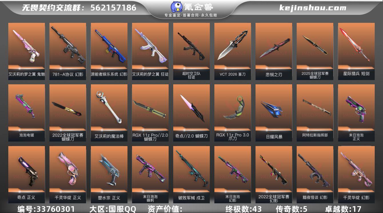 【960750】【套装】:2025全球冠军赛套装,2022全球冠军赛套装,VCT 2026 赛季套装,无畏契约季前邀请赛套装,末日泡泡套装,掠影//3.0套装 【英雄】:幻棱,炼狱,维斯,暮蝶,钛狐,壹决,铁臂,捷风,雷兹,幽影,不死鸟,贤者,猎枭,蝰蛇,零,芮娜,奇乐,尚勃勒,霓虹,斯凯,夜露,星礈,K/O,海神,盖可,黑梦,钢锁 【近战武器】:近战武器-2025全球冠军赛 蝴蝶刀,近战武器-2022全球冠军赛 蝴蝶刀,近战武器-蒙太奇 战斧,近战武器-碎心裂刃,近战武器-VCT 2026 篆刀,近战武器-影蝶,近战武器-无畏契约季前邀请赛 悲悯之刃,近战武器-泡泡电锯,近战武器-魔术火花,近战武器-影钩,近战武器-RGX 11z Pro//2.0 蝴蝶刀,近战武器-奇点//2.0 蝴蝶刀,近战武器-紫金爪刀,近战武器-RGX 11z Pro//3.0 爪刀,近战武器-艾沃莉的魔法棒,近战武器-鬼丸国纲,近战武器-天御刀,近战武器-日耀风暴 遗器,近战武器-阿特拉斯指挥部 甩棍,近战武器-星际猎兵 短剑,近战武器-魔术火花 【狂徒】:狂徒-2025全球冠军赛,狂徒-归零者,狂徒-洪荒怒焰,狂徒-全息波普//2.0,狂徒-塑水宗,狂徒-偃月苍龙,狂徒-噬影者,狂徒-RGX 11z Pro,狂徒-光荣异象,狂徒-多弥尔的复仇,狂徒-艾...