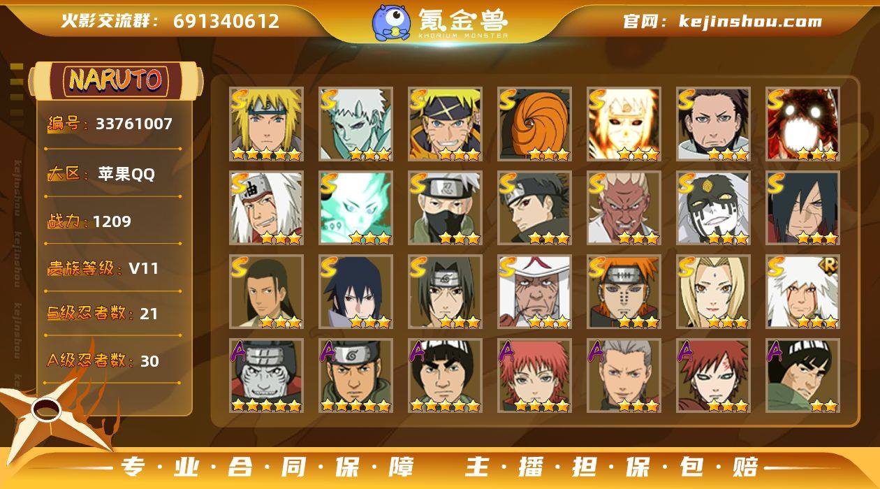 【HYC1672】VIP等级V11/战力1209W/S忍数量21/A忍数量30/二星A-大野木「侠隐江湖」/三星S-纲手/三星S-波风水门「九喇嘛连结」/三星S-宇智波带土「十尾人柱力」/二星A-达鲁伊「五代目雷影」/二星A-飞段「死司凭血」/五星A-猿飞阿斯玛/三星S-旗木卡卡西「须佐能乎」/三星S-烈斗「初代目风影」/五星A-迈特凯/三星S-千手柱间·木叶创立/三星S-大筒木桃式/二星A-长十郎「六代目水影」/二星A-蝎「绯流琥」/三星S-漩涡鸣人 「暴怒·第六尾」/二星A-桃地再不斩「秽土转生」/三星S-自来也 「传说中的三忍」/五星S-波风水门/二星A-佩恩·六道「漂泊浪客」/三星S-猿飞日斩/二星A-黑土「四代目土影」/二星A-神农 「羁绊」/二星A-迪达拉/二星A-不缘/二星A-宇智波鼬/三星S-宇智波佐助「永恒万花筒」/三星A-飞段/三星S-佩恩「天道」/三星S-漩涡鸣人·宇智波佐助/四星A-蝎/三星S-大筒木舍人 「最终章」/二星A-秋道丁次「忍界大战」/二星A-角都「秽土转生」/三星A-我爱罗「疾风传」/二星A-李洛克「忍界大战」/三星S-自来也「舞之豪杰」/三星S-宇智波止水「须佐能乎」/二星A-宇智波鼬 「夏日限定」/二星A-宇智波泉奈/二星A-旗木卡卡西 「幻之真容」/二星A-巳月「仙人模式」/三星S-艾「忍界大战」/三星...