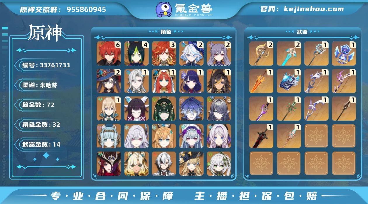 72黄!3+1火神!月绽放战舰!月感电战舰!冰水战舰!纳塔战舰!龙芙万希!雷九夏班!2命芙宁娜!1+1龙王!0+1娜维娅!0+1茜特菈莉!0+1伊涅芙!0+1夜兰!0+1宵宫!0+1绫华!1命雷神!少女!奈芙尔!菈乌玛!菲林斯!丝柯克!爱可菲!恰斯卡!万叶!钟离!仆人!满命迪卢克 四命提纳里 三命玛薇卡 二命刻晴,二命莫娜,二命芙宁娜 一命琴,一命雷电将军,一命妮露,一命迪希雅,一命那维莱特 枫原万叶,神里绫华,宵宫,七七,钟离,八重神子,夜兰,纳西妲,娜维娅,阿蕾奇诺,希诺宁,恰斯卡,茜特菈莉,梦见月瑞希,爱可菲,丝柯克,伊涅芙,菈乌玛,菲林斯,奈芙尔,哥伦比娅 拥有武器: 狼的末路,雾切之回光,飞雷之弦振,和璞鸢,阿莫斯之弓,天空之刃,贯虹之槊,天空之脊,若水,万世流涌大典,裁断,焚曜千阳,祭星者之望,支离轮光 2精武器: 天空之刃,裁断 1精武器: 狼的末路,雾切之回光,飞雷之弦振,和璞鸢,阿莫斯之弓,贯虹之槊,天空之脊,若水,万世流涌大典,焚曜千阳,祭星者之望,支离轮光 亮点: tap已注销
