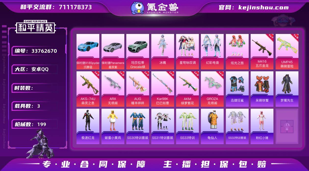 安卓Q 可二次 3载具6粉装9特效枪8热门164套装199枪皮 66092热力值 13印记 历史绝世王牌15星 保时捷918Spyder(沉静蓝) 保时捷Panamera(星辰紫) 玛莎拉蒂G绿色 冰魄 花中眠 鸢尾珑雾 炫光之旅 星穹咏叹调 幻彩电音 M416-五爪金龙 (7级) GROZA-无垠阁 (3级) AKS-74U-森灵之息 (5级) AKM-绿萝繁花 (5级) Kar98K-巳巳如意 (5级) AUG-暖羊咩咩 (5级) ARX-无垠阁 (5级) Mk14-福马献瑞 (5级) UMP45-萌骑冒险 (5级) 龟仙人 梦魇先生 呆萌铁蟹 迅捷狂鲨 粉红小猪 破蛋小黄鸡 极速红龙 M24-奇异狩猎者 镜光幻境飞行翼 和平精英账号