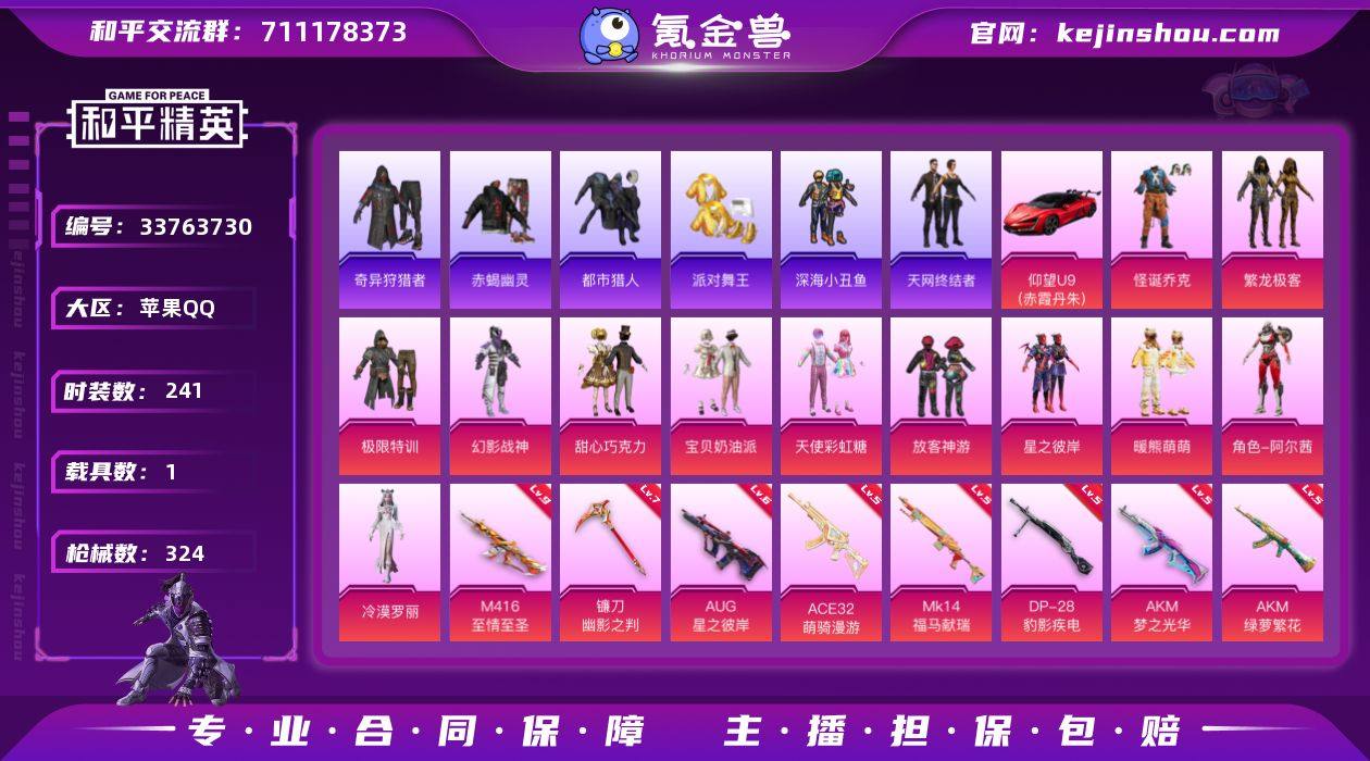 241套装/枪械16/装备381/载具1/战备211/王牌印记16/热力值100009/五级AKM-梦之光华/五级AKM-绿萝繁花/五级SCAR-L-锦绣绵绵/四级M416-五爪金龙/九级M416-至情至圣/五级GROZA-镜光银凌/六级AUG-星之彼岸/五级AUG-暖羊咩咩/五级ACE32-萌骑漫游/五级UMP45-量子极限/四级Kar98K-未来歌姬/五级Kar98K-巳巳如意/五级MK14-甜梦熊击/五级MK14-福马献瑞/五级DP-28-豹影疾电/七级镰刀-幽影之判/怪诞乔克/繁龙极客/浪漫天命/赤蝎幽灵/都市猎人/派对舞王/深海小丑鱼/小丑鱼/奇异狩猎者/天网终结者/暗夜之虎/龟仙人/暗影哥特/熔岩游骑兵连帽夹克/红熊茄茄/极限特训/幻影战神/甜心巧克力/宝贝奶油派/天使彩虹糖/放客神游/星之彼岸/暖熊萌萌/阿尔茜/冷漠罗丽/仰望U9(赤霞丹朱)/AKM梦之光华/AKM绿萝繁花/SCAR-L-锦绣绵绵/M416五爪金龙/M416至情至圣/GROZA-镜光银凌/AUG星之彼岸/AUG-暖羊咩咩/ACE32-萌骑漫游/UMP45量子极限/Kar98K未来歌姬/Kar98K-巳巳如意/MK14-甜梦熊击/MK14-福马献瑞/DP-28-豹影疾电/镰刀-幽影之判/酣梦熊熊飞行器/祥瑞起舞飞行器/飞行器-星之彼岸/变形金刚飞行器/龙翔九天飞行器/万象金身飞行器/极限特训降落伞/甜心宝贝降落伞/星之彼岸降落伞/洛神天依降落伞/暖熊萌萌降落...
