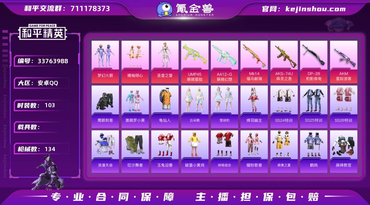 【960866】M1046975【身法号3粉装-6特效枪 梦幻火箭 橘柚倾心 激萌罗小黑,狂沙舞者,浪漫天命 7级星际浪客】安卓手Q-3粉装-6特效枪-103套装-134枪皮-8王牌印记-超级王牌-38435热力值【3粉装】角色-圣堂之誓,梦幻火箭,橘柚倾心【6特效枪】AA12-G-萌骑幻想[5级],Mk14-福马献瑞[4级],AKM-星际浪客[7级],UMP45-萌骑冒险[3级],AKS-74U-森灵之息[5级],DP-28-豹影疾电[5级]【3稀有】激萌罗小黑,狂沙舞者,浪漫天命【3飞行器】鸡智如我飞行器,马上有福飞行器,红色滑翔尾迹【2头盔】深海小丑鱼头盔,幻影战神头盔【1背包】梦幻火箭背包【225其它衣服和枪皮】老实芭蕉,鹤鸣,狙击之神,绯格组合,SS37特训,朱霞炽焰,王牌教练,萌黄之夏,小财神当家,白糯汤圆,黑色伏地魔,柠萌假日,甜蜜告白,梦幻奶油,灼焰舞者,破蛋小黄鸡,吉莉礼服,野性战心,特训学院,SS22特训,海岛探路者,耀粉歌者,角色-绛羽幽主,红釉青花,蓝色守护者,完美偶像,蓝色运动,麻辣教官,田园牧歌,银河圣歌,轻风白浪,SS21特训,雪国风尚,青涩时光,马上有钱,玉兔迎春,龙舌兰冰茶,萌趣咩咩,热血青春,飞行日记,灵幻魔术师,玩偶服-喜羊羊,SS26特训,酒红色名流,牛气满满,猛禽,竞技名士,凌霄紫焰,漫步者,雪绒豹,黄色名流,萌鸡速递,天籁歌者,电...
