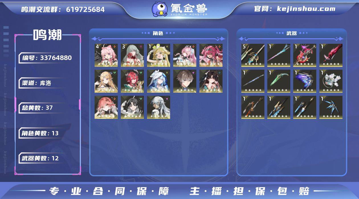 男/女主: 男主 总黄数: 37 联觉等级: 79 拥有五星共鸣者: 鉴心,卡卡罗,安可,维里奈,长离,折枝,相里要,守岸人,夏空,卡提希娅,露帕,弗洛洛,爱弥斯 4鸣五星共鸣者: 4鸣安可 3鸣五星共鸣者: 3鸣弗洛洛 1鸣五星共鸣者: 1鸣维里奈 0鸣五星共鸣者: 0鸣鉴心,0鸣卡卡罗,0鸣长离,0鸣折枝,0鸣相里要,0鸣守岸人,0鸣夏空,0鸣卡提希娅,0鸣露帕,0鸣爱弥斯 拥有五星武器: 浩境粼光,千古洑流,漪澜浮录,赫奕流明,琼枝冰绡,星序协响,血誓盟约,林间的咏叹调,不屈命定之冠,焰痕,幽冥的忘忧章,永远的启明星 5鸣五星武器: 5鸣血誓盟约 1鸣五星武器: 1鸣浩境粼光,1鸣千古洑流,1鸣漪澜浮录,1鸣赫奕流明,1鸣琼枝冰绡,1鸣星序协响,1鸣林间的咏叹调,1鸣不屈命定之冠,1鸣焰痕,1鸣幽冥的忘忧章,1鸣永远的启明星 亮点: 【MC270】79级/37黄/男主/13个五星角色/12个五星武器未绑定,爱弥斯,弗洛洛,露帕,卡提希娅,夏空,守岸人,相里要,折枝,长离,维里奈,鉴心,卡卡罗,安可,永远的启明星,幽冥的忘忧章,焰痕,不屈命定之冠,林间的咏叹调,血誓盟约,星序协响,琼枝冰绡,赫奕流明,浩境粼光,千古洑流,漪澜浮录,4命安可,3命弗洛洛,1命维里奈,0命爱弥斯,0命露帕,0命卡提希娅,0命夏空,0命守岸人,0命相里要,0命折枝,0命长离,0命...