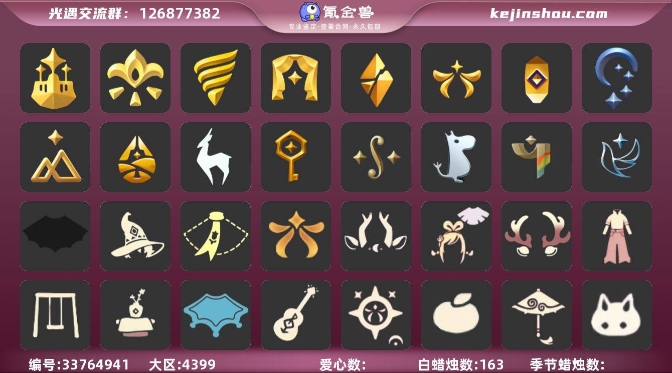 [19049565]安卓官服 邮箱账号 3珍稀物品 18毕业季 6毕业图 163蜡烛 【珍稀物品】白枭(帝企鹅发),透明蝶翼斗,彩虹围巾(五塑彩带斗) 【季节已毕业】梦想季,集结季,潜海季,表演季,破晓季,欧若拉季(欧若拉),追忆季,夜行季,拾光季,归巢季,九色鹿(九色鹿季),筑巢季,二重奏季,姆明季,彩染季,青鸟季,双星季,迁徙季 【完成地图】晨岛,云野,雨林,霞谷,墓土(暮土),禁阁 【礼包】牛仔裤(阔腿牛仔),爱心眼镜,巫师(巫师帽),绊爱(绊爱斗篷)(绊爱礼包),橘子(大橘大利),雪花(雪花发夹),兔子(玉兔头饰)(玉兔发饰)(兔子发饰),星月头饰(星月头冠),九色鹿角(神鹿祝福头饰)(神鹿祝福礼包),彩虹耳钉(彩虹耳饰),彩虹耳机,鹿角(圣诞鹿角),创始人(创始人斗篷),围巾(小王子斗篷)(小王子围巾),欧若拉之翼,蝙蝠套(蝙蝠斗篷)(南瓜头),猫套(皮皮猫斗)(皮皮猫礼包),瑞雪(瑞雪斗篷)(暖冬瑞雪),青衫落拓礼包,吉他(音韵吉他)(白吉他),人声乐器(欧若拉之声),红伞(瑞气纸伞),秋千(情人秋千),茶桌(花憩茶桌),猫背饰(猫咪背饰) 【裤子】筑巢季·裤子(设计师长袍),青鸟尊贵蓬头裤子(蓝色燕尾服),飞天裤(柔缎花边连)(九色鹿丝带裤),妮妮裙子(妮妮长裙),蓝绿裤(高领舞服),武士裤,背带裤,搓澡巾,击剑裤 【面具】黄眉企鹅面...