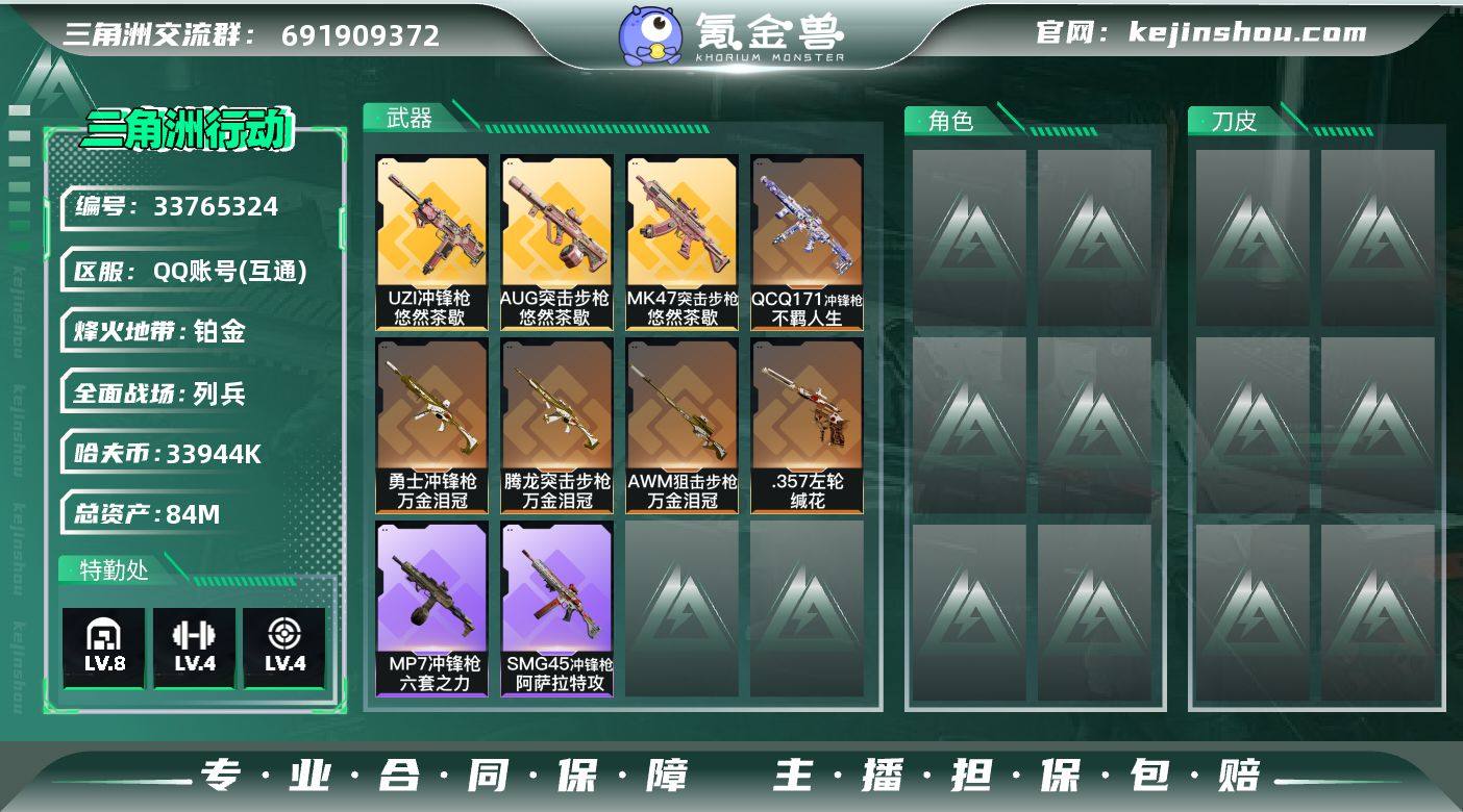 总资产84M/哈夫币3394万/传说枪皮数8/战场等级11/行动等级44/安全箱等时效性道具以游戏内数据为准,详情请看图/近战-黑鹰/AUG突击步枪-悠然茶歇/腾龙突击步枪-万金泪冠/MK47突击步枪-悠然茶歇/UZI冲锋枪-悠然茶歇/勇士冲锋枪-万金泪冠/QCQ171冲锋枪-不羁人生/AWM狙击步枪-万金泪冠/.357左轮-缄花/SMG45冲锋枪-阿萨拉特攻/MP7冲锋枪-六套之力/QJB201轻机枪-炽焰/SG552突击步枪-贴花艺术/ AK-12突击步枪-马年新春/SCAR-H战斗步枪-荣耀列队/Vector冲锋枪-先锋/Mini-14射手步枪-荣耀列队/QSZ92G-一帆风顺/QBZ95-1突击步枪-海浪/QBZ95-1突击步枪-海色/腾龙突击步枪-三角洲力量/K416突击步枪-几何迷彩/M16A4突击步枪-高雅黑/AUG突击步枪-浅蓝涂装/M7战斗步枪-黑巧甜心/SG552突击步枪-狂欢/SCAR-H战斗步枪-数码迷彩/CAR-15突击步枪-狂欢/MP5冲锋枪-海色/MP5冲锋枪-黄蜂/UZI冲锋枪-狂欢/野牛冲锋枪-高雅黑/M1014霰弹枪-高雅黑/M1014霰弹枪-重击/QJB201轻机枪-典雅/SR-25射手步枪-黄蜂/SV-98狙击步枪-红色涂装/沙漠之鹰-海浪/沙漠之鹰-高雅黑/挂饰-福禄/挂饰-聚宝盆/挂饰-万金泪冠/挂饰-悠然茶歇/挂饰-麻将