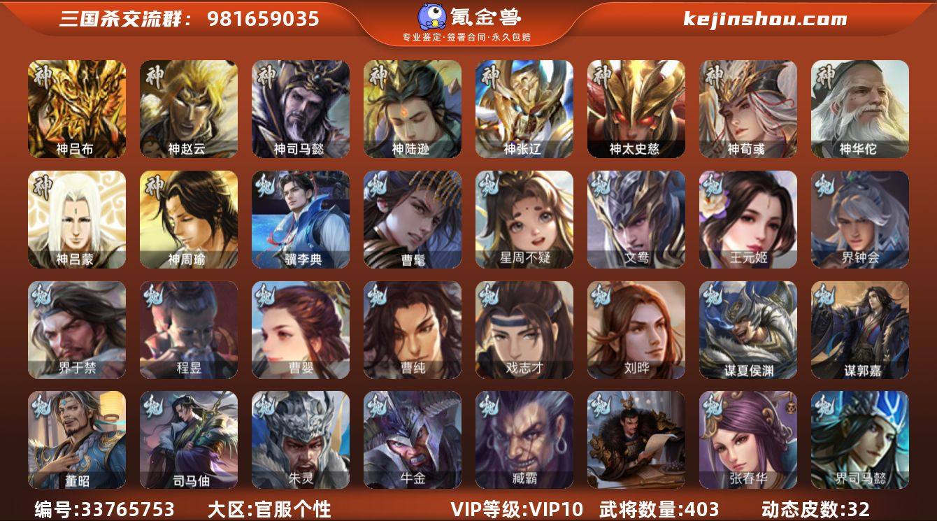 VIP等级: VIP10 官阶: 大将军 武将数量: 403 动态皮肤数量: 32 神将: 神陆逊,神吕布,神司马懿,神太史慈,神荀彧,神张辽,神赵云,神吕蒙,神周瑜,神华佗 魏国武将: 刘晔,戏志才,曹纯,曹婴,程昱,界于禁,界钟会,王元姬,文鸯,张辽,SP蔡文姬,SP曹仁,SP关羽,SP贾诩,SP姜维,SP庞德,卞夫人,蔡贞姬,曹昂,曹操,曹冲,曹洪,曹丕,曹仁,曹叡,王异,张恭,鲁芝,界满宠,界曹植,满宠,荀攸,王基,钟繇,蒯越蒯良,郭嘉,牵招,荀彧,阮慧,杜畿,界郭嘉,崔琰,界曹丕,界荀彧,朱灵,界甄姬,吕虔,界王异,界许褚,界郭淮,陈群,界邓艾,界典韦,界曹休,谋甄姬,司马孚,袁涣,李通,乐进,辛宪英,郭淮,毛玠,界曹彰,郭皇后,毌丘俭,夏侯惇,曹植,司马朗,谋于禁,界曹操,星周不疑,许褚,界张辽,谋徐晃,张郃,钟会,文聘,曹彰,界夏侯惇,诸葛诞,司马懿,甄姬,杨阜,界徐晃,徐晃,孙资刘放,韩浩史涣,胡班,曹真,典韦,界夏侯渊,夏侯渊,李典,于禁,王双,邓艾,界司马懿,张春华,孟达-魏,臧霸,牛金,朱灵(国战),曹髦,司马伷,董昭,谋郭嘉,谋夏侯渊,骥李典 蜀国武将: 界黄忠,谯周,沙摩柯,谋马超,谋赵云,马云騄,徐庶,界魏延,杨仪,吕凯,界关羽,界诸葛亮,邓芝,界伊籍,费祎,严颜,界黄月英,界张嶷,赵云,张松,彭羕,李丰,界刘备,界刘禅,谋姜维,刘封,糜竺,谋...