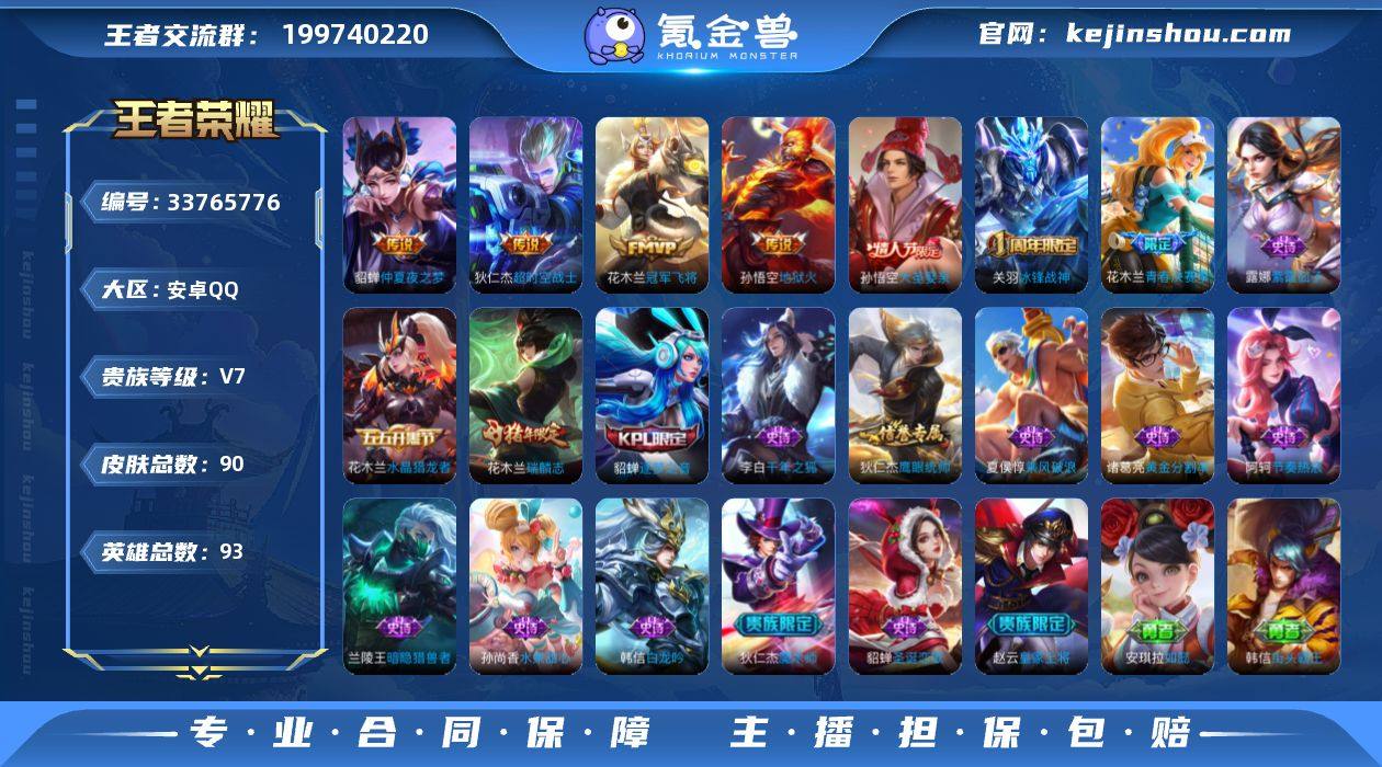 安卓Q-V7-荣耀黄金II段位-92英雄-90皮肤-4传说-18史诗 【传说皮肤】:花木兰冠军飞将,貂蝉仲夏夜之梦,孙悟空地狱火,狄仁杰超时空战士 【限定皮肤】:白起狰,狄仁杰阴阳师,赵云皇家上将,芈月重明,夏侯惇朔风刀,曹操烛龙,狄仁杰魔术师,狄仁杰万华元夜,项羽海滩派对,老夫子醍醐杖,关羽冰锋战神,貂蝉逐梦之音,程咬金演武夺筹,花木兰青春决赛季,花木兰瑞麟志,孙悟空大圣娶亲,牛魔御旌,钟馗驱傩正仪,太乙真人饕餮,鬼谷子原初探秘者,弈星混沌棋,明世隐疑决卦,狂铁御狮,米莱狄御霄,盾山御銮 【年限皮肤】:花木兰瑞麟志 【赛季限定】:白起狰,太乙真人饕餮,曹操烛龙,芈月重明,狂铁御狮,米莱狄御霄,牛魔御旌,盾山御銮,夏侯惇朔风刀,弈星混沌棋,明世隐疑决卦,老夫子醍醐杖,鬼谷子原初探秘者,狄仁杰万华元夜,程咬金演武夺筹,钟馗驱傩正仪 【史诗皮肤】:狄仁杰鹰眼统帅,花木兰瑞麟志,孙悟空大圣娶亲,阿轲节奏热浪,花木兰青春决赛季,诸葛亮黄金分割率,兰陵王暗隐猎兽者,夏侯惇乘风破浪,花木兰水晶猎龙者,貂蝉逐梦之音,关羽冰锋战神,韩信白龙吟,李白千年之狐,孙尚香水果甜心,狄仁杰魔术师,貂蝉圣诞恋歌,赵云皇家上将,露娜紫霞...