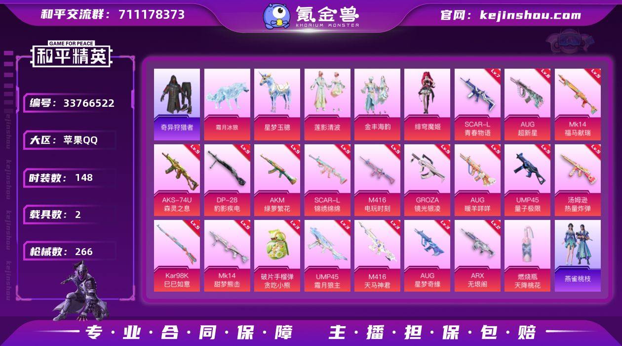 148套装/枪械20/装备278/载具2/战备152/王牌印记12/热力值76752/三级UMP45-霜月狼主/五级AKM-绿萝繁花/七级SCAR-L-青春物语/五级SCAR-L-锦绣绵绵/五级M416-电玩时刻/三级M416-天马神君/五级GROZA-镜光银凌/六级AUG-超新星/三级AUG-星梦奇缘/五级AUG-暖羊咩咩/二级ARX-无垠阁/五级UMP45-量子极限/五级汤姆逊-热量炸弹/五级AKS-74U-森灵之息/五级Kar98K-巳巳如意/五级MK14-甜梦熊击/五级MK14-福马献瑞/五级DP-28-豹影疾电/五级燃烧瓶-天降桃花/三级破片手榴弹-贪吃小熊/浪漫天命/小丑鱼/奇异狩猎者/龟仙人/暗影哥特/Mark.06/大砍刀-青龙偃月刀/莲影清波/金丰海韵/绯穹魔姬/星梦玉骢/霜月冰狼/AKM绿萝繁花/SCAR-L青春物语/SCAR-L-锦绣绵绵/M416电玩时刻/M416-天马神君/GROZA-镜光银凌/AUG超新星/AUG星梦奇缘/AUG-暖羊咩咩/ARX-无垠阁/UMP45量子极限/UMP45-霜月狼主/汤姆逊-热量炸弹/AKS-74U-森灵之息/Kar98K-巳巳如意/MK14-甜梦熊击/MK14-福马献瑞/DP-28-豹影疾电/燃烧瓶-天降桃花/破片手榴弹-贪吃小熊/炫彩糖果飞行器/祥瑞锦鲤飞行器/冰狼掠影飞行器/纱华羽翼飞行器/萌物绒绒降落伞/莲影清波降落伞/沙丘之主降落伞/江南烟雨降落伞/星梦奇缘降落伞/忍者神龟降落伞/千金淑猫降落伞...