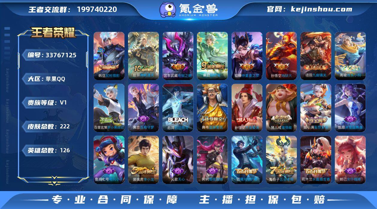 F1028/苹果Q/【特价号/买到即赚到】222皮肤/1典藏皮肤/5传说/57史诗/最强王者段位/125英雄 【荣耀典藏】:韩信弑枪猎影 【传说皮肤】:后羿神树通天,桑启鸣野蒿,貂蝉仲夏夜之梦,宫本武藏地狱之眼,孙悟空地狱火 【限定皮肤】:白起狰,姜子牙天穹之誓,狄仁杰阴阳师,赵云皇家上将,墨子神迹守卫,嬴政白昼王子,孙尚香蔷薇恋人,鲁班七号狮舞东方,高渐离死亡摇滚,芈月重明,吕布猎兽之王,元歌无心,夏侯惇朔风刀,甄姬游园惊梦,曹操烛龙,典韦穷奇,典韦蓝屏警告,狄仁杰魔术师,狄仁杰万华元夜,达摩沙漠行僧,项羽海滩派对,老夫子醍醐杖,老夫子航海奇遇记,程咬金演武夺筹,刘邦夺宝奇兵,兰陵王金庭之子,孙悟空大圣娶亲,牛魔御旌,后羿圣弓游侠,李元芳云中旅人,钟馗神迹守卫,钟馗驱傩正仪,杨玉环遇见飞天,女娲朔望之晖,干将莫邪真爱魔法,雅典娜黎明之约,太乙真人饕餮,太乙真人华丽摇滚,鬼谷子原初探秘者,鬼谷子五谷丰年,苏烈千军破阵,弈星混沌棋,梦奇顽趣,沈梦溪大漠名商,明世隐疑决卦,裴擒虎李小龙,裴擒虎擒涛扼浪,狂铁御狮,米莱狄御霄,云中君纤云弄巧,盾山御銮,猪八戒猪悟能,上官婉儿梁祝,鲁班大师探海日志,桑启海盐诗旅,阿古朵...