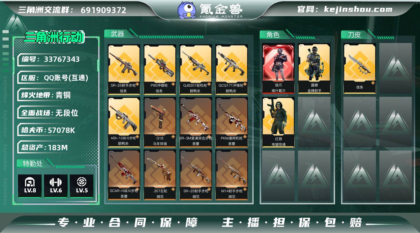 A12715/包人脸/QQ区【总资产:183.7M+近战信条+骇爪维什戴尔+20发AW子弹】/烽火等级:53级/全面战场:1级/纯币:57078K/三角券加币:47(三角币47)【近战-信条】【骇爪-维什戴尔】【红狼-电锯惊魂/露娜-金牌射手】/部门:23331/特勤等级(技术中心3级/工作台3级/制药台3级/防具台3级/仓库8级/指挥中心5级/训练中心6级/靶场5级/潜水中心2级)(流动资产:162.3M)M4A1突击步枪-阿米娅/KC17突击步枪-电锯惊魂/P90冲锋枪-信条/SCAR-H战斗步枪-启航/R93狙击步枪-维什戴尔/SR-25射手步枪-信条/4橙色挂饰/段位:青铜III/详细看图