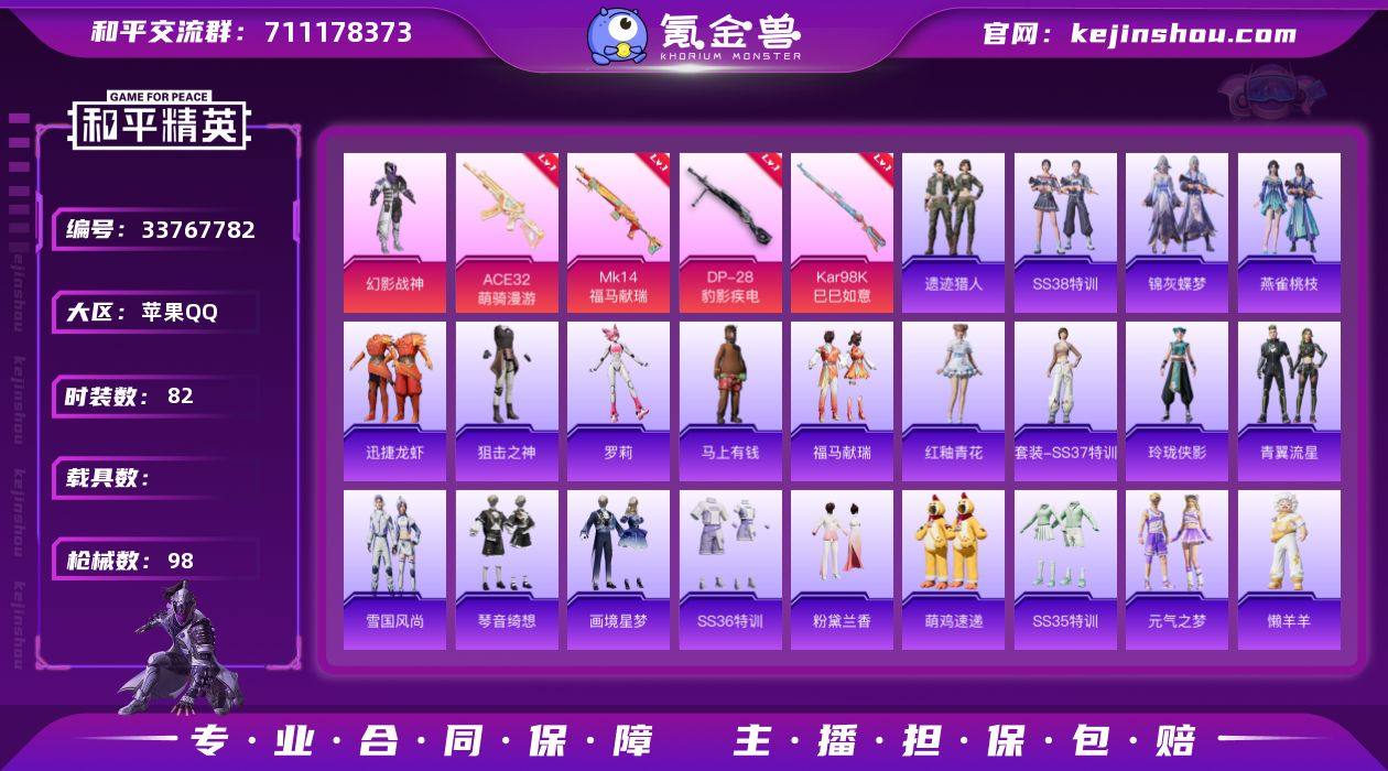 可二次【小熊背包暗夜之虎4特效枪1粉装冷酷挑战者 秒换绑不用等】 苹果Q区-24189热力值-82套装-98枪皮 【3稀有】 萌熊伴侣背包(小熊背包) 暗夜之虎 冷酷挑战者【1粉装】 幻影战神【4特效枪】 Mk14-福马献瑞(5级) ACE32-萌骑漫游(5级) Kar98K-巳巳如意(5级) DP-28-豹影疾电(5级)【127热门】 极速红龙 忍者信条 白色伏地魔 AWM-雷霆特警 SCAR-L-玉兔迎春 AUG-幻影战神 MG3-幻世战舞者 破蛋小黄鸡 长空猛禽 弄潮海豚 特训学院 青涩时光 青年教官 魅力单车 猎鹰 蓝色运动 橘黑制服 竞技达人朋克 黄色运动 漫步者 黄色伏地魔 红色运动 黑色伏地魔 海岛探路者 暗夜之虎 S1897-糯团青竹 AA12-G-雨过天青 沙漠之鹰-雨过天青 平底锅-画境星梦 P90-紫矿核心 GROZA-紫矿核心 玲珑侠影 M16A4-雨过天青 AC-VAL-荒原烈焰 SPAS-12-福马献瑞 Vector-荒原烈焰 雨过天青 MG-36-薄荷星砂 GROZA-福马献瑞 撬棍-冰晶雪宝 福马献瑞 大橘大利 破片手榴弹-爆破雪人 莫辛纳甘-鸢尾珑雾 ACE32-冰晶雪宝 青翼流星 SS33特训 SS32特训 巳巳如意 游乐 MG3-霓彩脉冲 粉黛兰香 狂鲨锋刃 SS36特训 大砍刀-像素花束 MG3-火熔核心 异域银装 罗莉 战术大师 蜜獾-启元战纹 迅捷龙虾 马上有钱 狙击之神 破片手榴弹-...