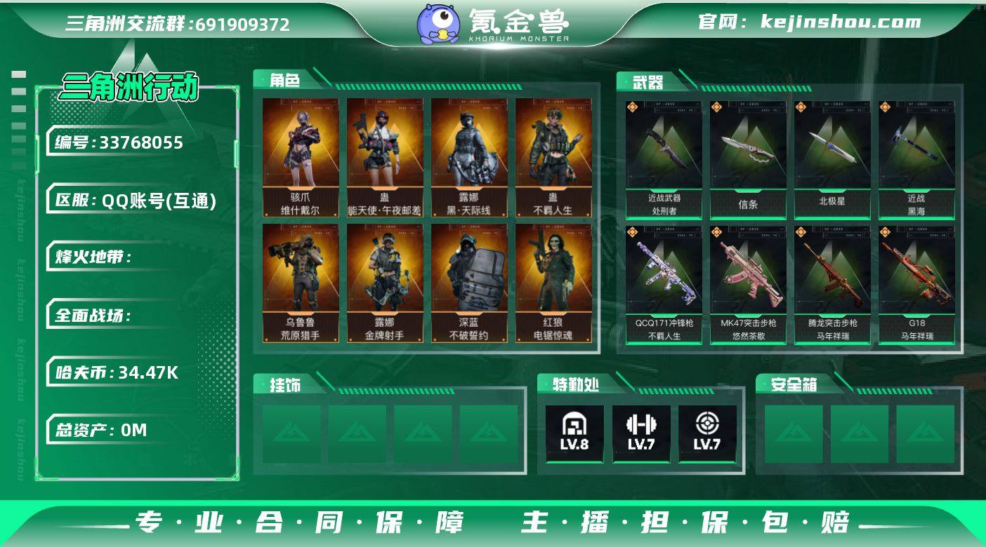 400m总资产-34473k哈夫币-60烽火等级-钻石-13战场等级-列兵 【干员外观】:露娜-黑·天际线,蛊-能天使午夜邮差,骇爪-维什戴尔,蜂医-送葬人·无题密令,无名-夜鹰,深蓝-不破誓约,红狼-电锯惊魂,露娜-金牌射手,乌鲁鲁-荒原猎手,蛊-不羁人生 【近战皮肤】:近战-北极星,近战-信条,近战-黑海,近战-处刑者4级,近战-黑鹰 【传说外观】:M4A1突击步枪-阿米娅,AKM突击步枪-流光铂影,AKM突击步枪-锦绣,ASh-12战斗步枪-鹅鸭杀,M16A4突击步枪-狩猎时刻,AUG突击步枪-悠然茶歇,SG552突击步枪-运动员,AK-12突击步枪-夜鹰,AK-12突击步枪-特斯拉线圈,SCAR-H战斗步枪-水墨云图,SCAR-H战斗步枪-启航,G3战斗步枪-流光铂影,G3战斗步枪-狩猎时刻,G3战斗步枪-骑士,CAR-15突击步枪-阿米娅,腾龙突击步枪-马年祥瑞,腾龙突击步枪-万金泪冠,K437突击步枪-北极星,K437突击步枪-锦绣,KC17突击步枪-电锯惊魂,MK47突击步枪-悠然茶歇,MP5冲锋枪-黑海,P90冲锋枪-信条,Vector冲锋枪-狩猎时刻,Vector冲锋枪-能天使-午夜邮差,UZI冲锋枪-流光铂影,UZI冲锋枪-特斯拉线圈,UZI冲锋枪-悠然茶歇,SMG-45冲锋枪-骑士,SMG-45冲锋枪-锦绣,SR-3M紧凑突击步枪-特斯拉线圈,勇士冲锋枪-...