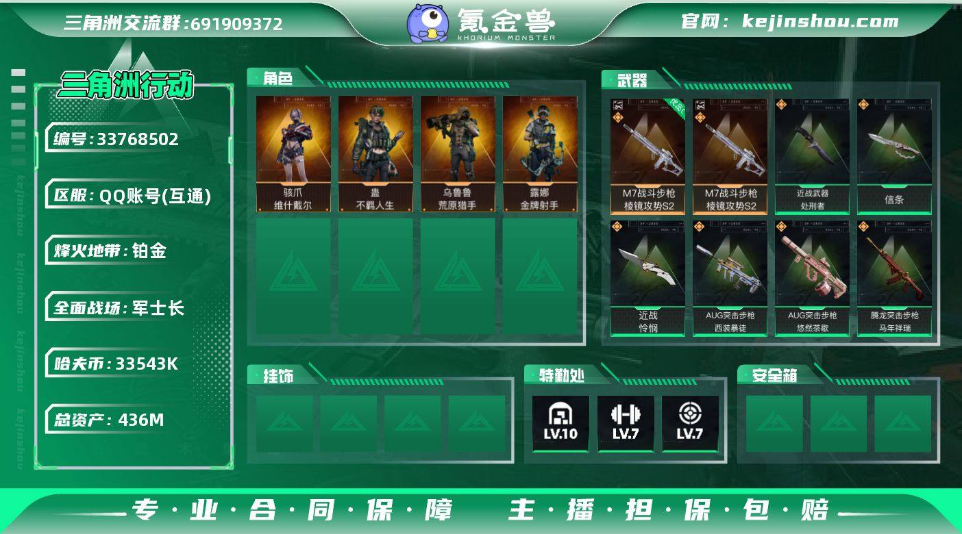 【959487】【包人脸】【玩够能回血】【1红2刀1砖】436m+S9赛季3*3 sjs11141 436m总资产-33543k哈夫币-60烽火等级-铂金-33战场等级-军士长 【干员外观】:骇爪-维什戴尔,露娜-金牌射手,乌鲁鲁-荒原猎手,蛊-不羁人生 【近战皮肤】:近战-信条,近战-怜悯,近战-处刑者1级,近战-黑鹰 【典藏外观】:M7战斗步枪-棱镜攻势S2 【典藏外观成色】:M7战斗步枪-棱镜攻势S2(优品C) 【传说外观】:M4A1突击步枪-阿米娅,AKM突击步枪-锦绣,ASh-12战斗步枪-鹅鸭杀,K416突击步枪-尖峰行动,K416突击步枪-行动记录,AUG突击步枪-悠然茶歇,AUG突击步枪-西装暴徒,M7战斗步枪-怜悯,M7战斗步枪-机动小队,SG552突击步枪-运动员,SCAR-H战斗步枪-启航,G3战斗步枪-骑士,CAR-15突击步枪-阿米娅,腾龙突击步枪-马年祥瑞,K437突击步枪-锦绣,KC17突击步枪-电锯惊魂,MK47突击步枪-悠然茶歇,P90冲锋枪-信条,UZI冲锋枪-悠然茶歇,SMG-45冲锋枪-锦绣,SR-3M紧凑突击步枪-荼蘼,QCQ171冲锋枪-鹅鸭杀,M250通用机枪-骑士之心,QJB201轻机枪-鹅鸭杀,M14射手步枪-蛮荒,M14射手步枪-缄花,SKS射手步枪-骑士,SR-25射手步枪-信条,SR-25射手步枪-缄花,R93狙击步枪-维什戴尔,.357左轮-缄花,G1...