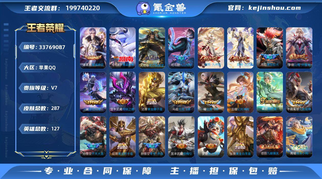 贵族等级7/荣耀典藏数量1/传说皮肤数量20/史诗皮肤数量81/皮肤数量287/英雄数量127/段位永恒钻石/孙权全皮/敖隐全皮/赵怀真全皮/戈娅全皮/影全皮/星域神启/怪盗基德/死亡执政官/九山相柳/愿照·山河定/愿照·九州拓/幻光神枪/鸣野蒿/琥珀纪元马超/澜逐花归海/惊梅引/齐天大圣/山海·炽霜斩/无双飞将/零号·赤焰/云鹰飞将/黄金白羊座/久胜战神/黄金狮子座/胖达荣荣/黄金射手座/地狱之眼/凤鸣九霄/蔡文姬夏日便利店/虞姬夏日便利店/天穹之誓(s36)/破阵·退雄兵/谪仙醉月/阴阳师/皇家上将/奇幻香踪/云间偶戏/无心/魔术师/万华元夜(s22)/沙漠行僧(s26)/海滩派对/醍醐杖(s20)/演武夺筹(s23)/金庭之子(s27)/潮玩骑士王/美猴王/至尊宝/云中旅人(s29)/驱傩正仪(s24)/胡桃夹子/原初探秘者(s21)/原初追遂者/大漠名商(s28)/李小龙/擒涛扼浪(s31)/纤云弄巧/拒霜思/玲珑珍味/探海日志(s32)/海盐诗旅(s30)/驭风魔法/鹤归松栖(赵怀真)/江河有灵/古海寻踪(s33)/百解令(蒙犽)/蒙恬荣光圣徽/高渐离燃音魔法/妲己灵卜魔法/鬼谷子天穹祈灯(S34)/琥珀纪元伽罗/妄想食味/龙武盛年/蔬乡物语(鲁班七号)/蔬乡物语(李元芳)/剑破天穹(s35)/程咬金群星魔术团/青焰无极/苍威无极/刘备异域游侠/熔金海岸/噬灭天穹(...
