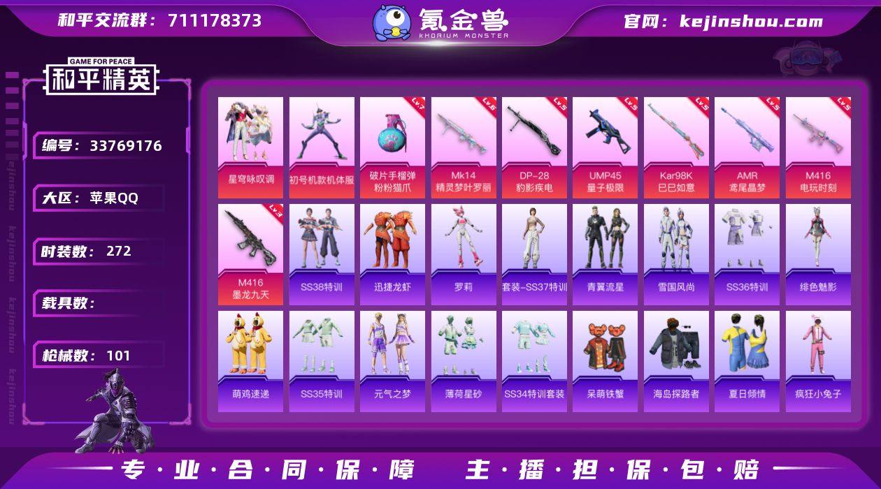 【主播推荐】实名: 不可修改 时装数: 272 枪械数: 101 战备数: 51 热门装扮: 呆萌铁蟹,初号机款机体服,星穹咏叹调 稀有枪皮: M416电玩时刻,Mk14精灵梦叶罗丽,M416墨龙九天,AMR鸢尾晶梦,破片手榴弹粉粉猫爪,UMP45量子极限,Kar98K-巳巳如意,DP-28-豹影疾电