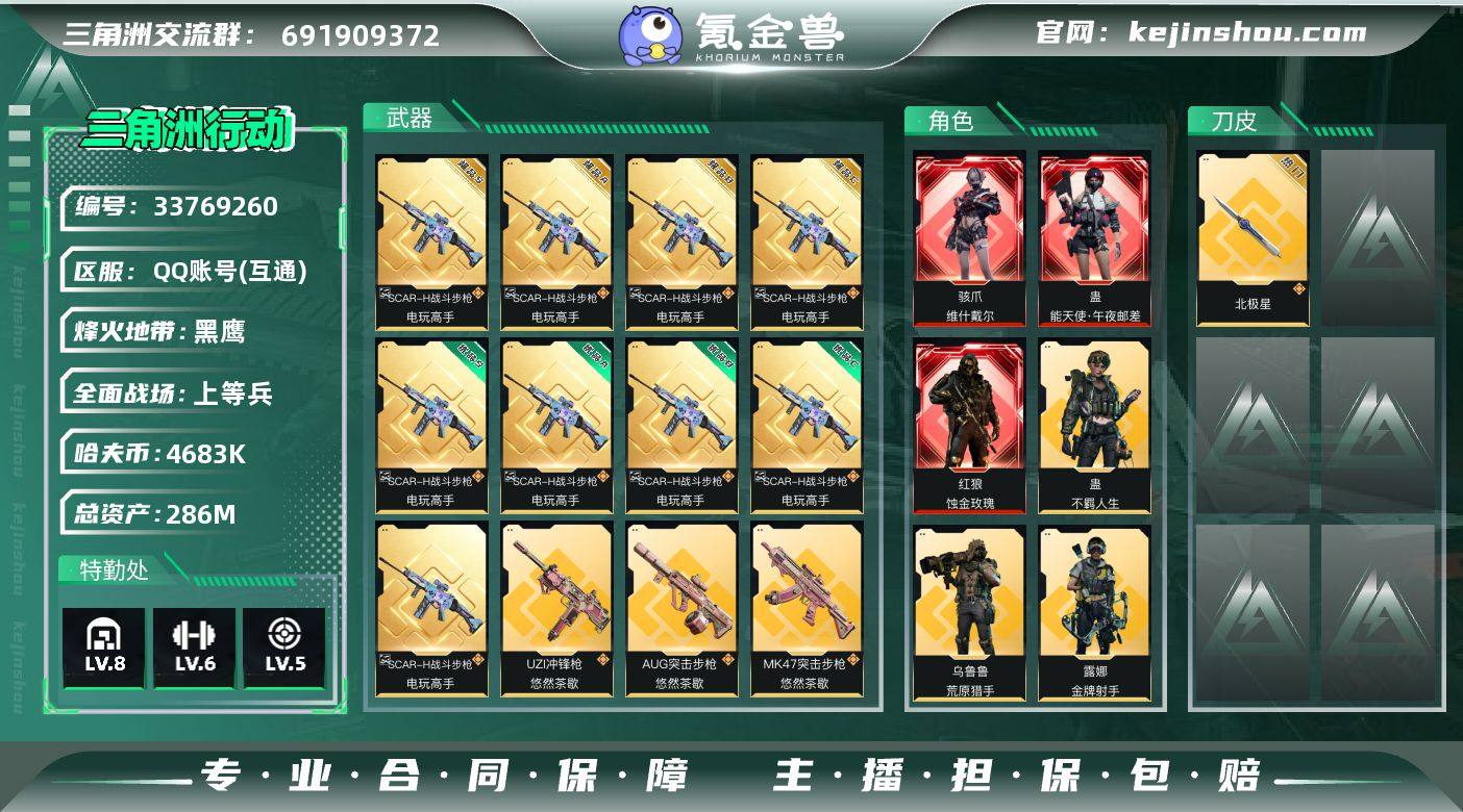 编号A01462 可二次等级60 总资产286m 流动资产258.9m 哈夫币4683k 2刀皮 3红皮 1典藏枪 基础安全箱 仓库lv8 指挥中心5 训练中心lv6 靶场lv5,近战-北极星,近战-处刑者,蛊-午夜邮差,骇爪-维什戴尔,红狼-蚀金玫瑰,极品sSCAR-H战斗步枪-电玩高手