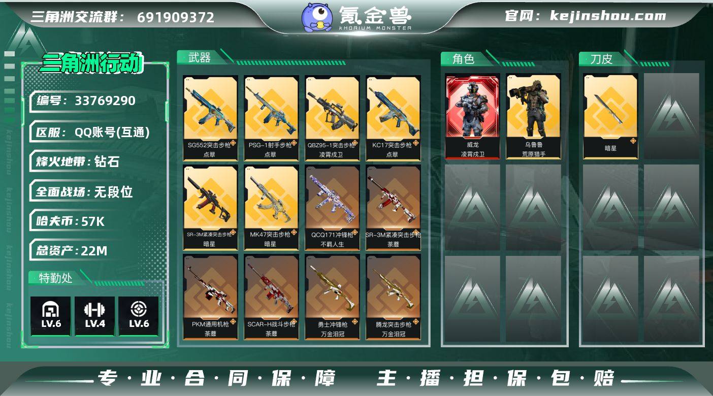 【960987】22m总资产-57k哈夫币-60烽火等级-钻石-4战场等级-无军衔 【干员外观】:威龙-凌霄戍卫,乌鲁鲁-荒原猎手 【近战皮肤】:近战-暗星,近战-黑鹰 【传说外观】:QBZ95-1突击步枪-凌霄戍卫,K416突击步枪-行动记录,SG552突击步枪-点翠,SCAR-H战斗步枪-荼蘼,腾龙突击步枪-万金泪冠,KC17突击步枪-点翠,MK47突击步枪-暗星,SR-3M紧凑突击步枪-暗星,SR-3M紧凑突击步枪-荼蘼,勇士冲锋枪-万金泪冠,QCQ171冲锋枪-不羁人生,PKM通用机枪-荼蘼,M14射手步枪-蛮荒,M14射手步枪-缄花,SKS射手步枪-骑士,SR-25射手步枪-缄花,PSG-1射手步枪-点翠,AWM狙击步枪-万金泪冠,.357左轮-缄花 【史诗外观】:K416突击步枪-冬日风情,K416突击步枪-腊梅,SG552突击步枪-深海恐惧,G3战斗步枪-哈夫克警备,K437突击步枪-丛影谍踪,MP5冲锋枪-竞技风,Vector冲锋枪-猎鳄行动,SR-3M紧凑突击步枪-开工大吉,勇士冲锋枪-丛影谍踪,MP7冲锋枪-六套之力,PKM通用机枪-阿萨拉特攻,M249轻机枪-丛影谍踪,QJB201轻机枪-炽焰,VSS射手步枪-丛影谍踪,M14射手步枪-工业狂潮, M14射手步枪-航天庆典,SV-98狙击步枪-囚徒 【稀有外观】:AKM突击步枪-肃杀,K416突击步枪-一帆风顺,SG552突击步...