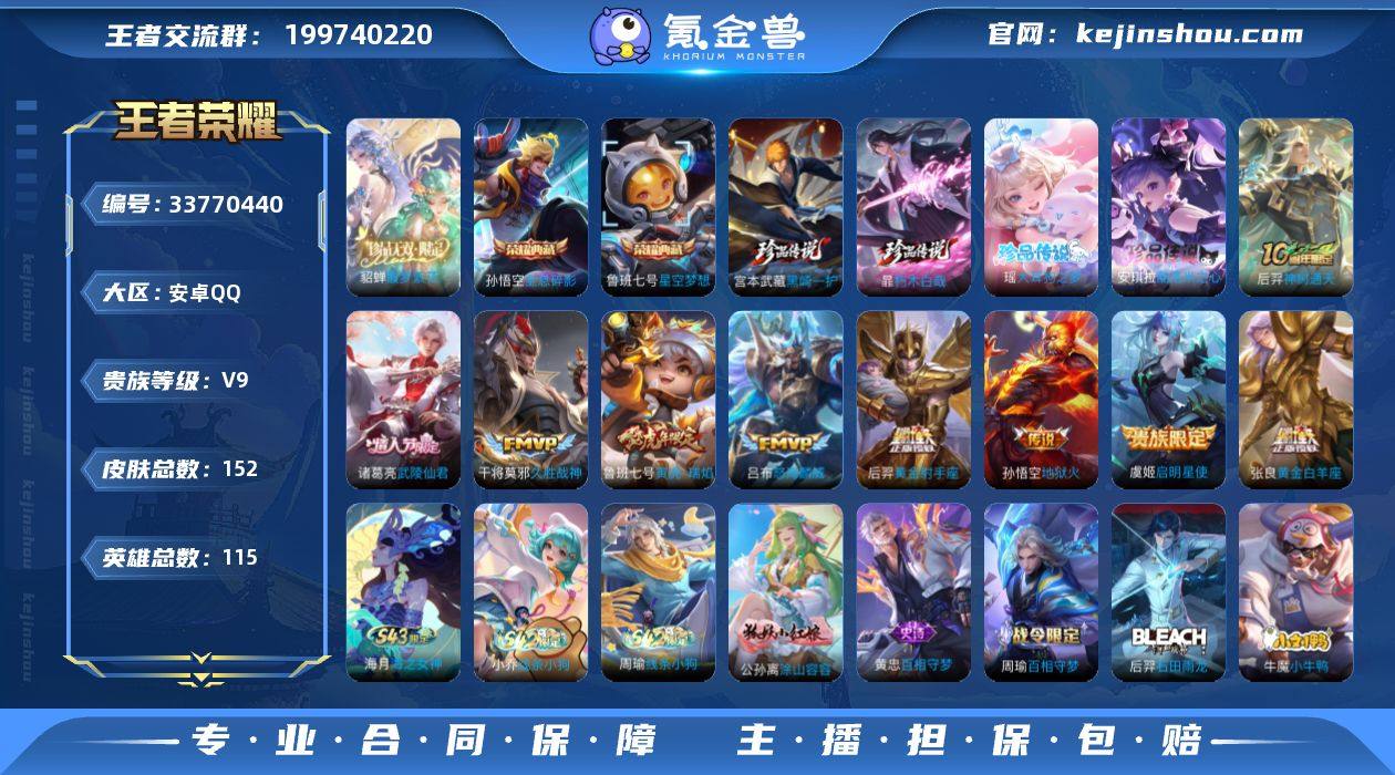 【WZN5928】贵族等级9/荣耀典藏数量2/传说皮肤数量9/史诗皮肤数量48/皮肤数量152/英雄数量115/段位尊贵铂金/空空儿全皮/全息碎影/星空梦想/馥梦繁花/黑崎一护/朽木白哉/酷洛米之心/大耳狗之梦/神树通天/怒海麟威/寅虎·瑞焰/启明星使/黄金白羊座/久胜战神/黄金射手座/武陵仙君/地狱火/阴阳师/皇家上将/云间偶戏/朔风刀(s17)/魔术师/万华元夜(s22)/海滩派对/醍醐杖(s20)/潮玩骑士王/至尊宝/原初探秘者(s21)/混沌棋(s18)/疑决卦(s19)/御銮(s16)/梁祝/苍威无极/虚灵犬护/逆浪荇歌/荣光之誓/鸭鸭历险记-刘禅/鸭鸭历险记-沈梦溪/百相守梦-周瑜/百相守梦-孙策/线条小狗-周瑜/线条小狗-小乔/海月海之女神/涂山容容/百相守梦-黄忠/石田雨龙/小牛鸭/龙之律动/乐园奇幻夜/魅语/青蛇/晚萤/鹰眼统帅/箭羽风息/节奏热浪/星夜王子/功夫厨神/逐浪之夏/天才门将/曙光守护者/特工魅影/心灵骇客/冰冠公主/心灵战警/黄金分割率/暗隐猎兽者/乘风破浪/水晶猎龙者/白龙吟/乱世虎臣/末日机甲-吕布/千年之狐/幽灵船长/圣诞狂欢/魅力维加斯/暗夜贵公子/水果甜心/鬼剑武藏/偶像歌手/圣诞恋歌/未来纪元-赵云/紫霞仙子/电玩小子/班班快跑/鹤鸣心笺/踏浪烽翎/落日弦歌/戏梦巡演/死霸装/小满鸭/潮玩士官长/命...