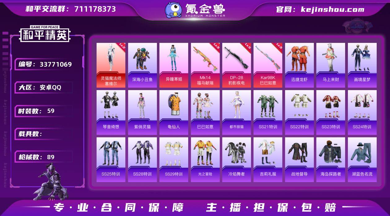 【961032】安卓【极品神装号/灵猫魔法师-塞维尔(二级)/】手Q-1神装-1粉装-3特效枪-1粉色飞行器-24911热力值-59套装-89枪皮 【红色神装等级】:灵猫魔法师-塞维尔(二级) 【红色角色神装】:灵猫魔法师-塞维尔 【热门品类】:套装-深海小丑鱼,套装-龟仙人 【粉色套装】:角色-异瞳寒姬 【粉色枪皮等级】:Kar98K-巳巳如意(五级),Mk14-福马献瑞(五级),DP-28-豹影疾电(五级) 【粉色枪皮】:Kar98K-巳巳如意,Mk14-福马献瑞,DP-28-豹影疾电 【粉色飞行器】:炫彩糖果飞行器 【粉色降落伞】:异瞳寒姬降落伞,极意拳锋降落伞,炫彩糖果降落伞 【稀有套装】:套装-龟仙人,套装-巳巳如意,套装-炫彩糖果,套装-马上来财,套装-迅捷龙虾,角色-都市丽猫,角色-紫俏灵猫,套装-画境星梦,套装-琴音绮想 【稀有枪皮】:AKM-破晓战魂,AKM-龙的传人,M16A4-幻世战舞者,SCAR-L-夜灯,SCAR-L-玉兔迎春,M416-红色方程式,AUG-天降萌叽,AUG-耀粉歌者,QBZ-彩虹符号,M762-天降萌叽,AC-VAL-天降萌叽,蜜獾-天降萌叽,ACE32-画境星梦,UZI-天降萌叽,UMP45-夜灯,UMP45-生命誓言,MP5K-画境星梦,P90-巳巳如意,Mini14-炫彩节奏,M1加兰德-画境星梦,S686-生命誓言,S686-红色方程式,S...