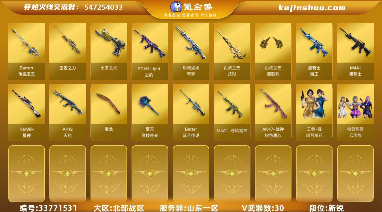 【961045】山东一区-31V-6王者武器数-0炫金武器数 【传说武器】:传说圣灵 【热门武器】:传说圣灵,Kar98K-星神,M4A1-黑骑士,羊驼玩偶 【王者炫金武器】:王者之力,王者之灵,高爆手雷-雷霆王者*2,烟雾弹-雷霆王者,闪光弹-雷霆王者 【音效卡】:M4A1-黑骑士音效卡,炼狱-百战金芒-庆典舞曲音效卡 【皮肤】:M4A1-再燃火线,战神-粉色甜心皮肤*2,轻型军用手斧-再燃火线,炽芒蝶刃-巅峰荣耀 皮肤 【角色】:电竞教官-云悠悠,王者-瞳-闭月羞花,葵-阿尔法武装,初恋灵狐,芳心审判者,麻雀,潘多拉-甜心教官,潜龙队-X,雪莉杨-摸金校尉 【人偶武器】:迷你裂空之翼,迷你牛牛,生化手雷-机甲核心 【挑战大师】:神圣爆裂者III,冰龙粉碎者-白马银枪 【英雄级武器】:M4A1-黑骑士,AK12-天启,SCAR Light-玄豹,黑骑士-海王,机械迷城-穹宇,Kar98K-星神,Barrett-暗月传说,炼狱-百战金芒,柯尔特-荣耀世冠EP,屠龙,擎天-竞技荣光*2,麒麟刺-百战金芒,高爆手雷-竞技荣光*2,高爆手雷-玄豹,闪光弹-竞技荣光*2,闪光弹-玄豹,烟雾弹-竞技荣光*5,烟雾弹-荣耀世冠EP,M4A1-苍鸣雷神 【其他武器】:源·火麒麟,源·雷神,魂·雷神-神秘按键,灵·HK417-朱雀-甜蜜火力,源-金...
