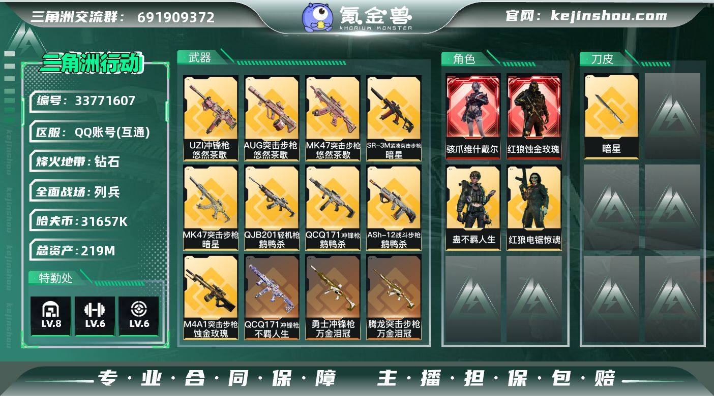 【961046】219m总资产-31657k哈夫币-60烽火等级-钻石-15战场等级-列兵 【干员外观】:红狼-蚀金玫瑰,骇爪-维什戴尔,红狼-电锯惊魂,蛊-不羁人生 【近战皮肤】:近战-暗星,近战-黑鹰 【传说外观】:M4A1突击步枪-蚀金玫瑰,M4A1突击步枪-阿米娅,AKM突击步枪-锦绣,ASh-12战斗步枪-鹅鸭杀,AUG突击步枪-悠然茶歇,SCAR-H战斗步枪-启航,CAR-15突击步枪-阿米娅,腾龙突击步枪-万金泪冠,K437突击步枪-锦绣,KC17突击步枪-电锯惊魂,MK47突击步枪-悠然茶歇,MK47突击步枪-暗星,UZI冲锋枪-悠然茶歇,SMG-45冲锋枪-锦绣,SR-3M紧凑突击步枪-暗星,勇士冲锋枪-万金泪冠,QCQ171冲锋枪-鹅鸭杀,QCQ171冲锋枪-不羁人生,QJB201轻机枪-鹅鸭杀,SKS射手步枪-骑士,R93狙击步枪-维什戴尔,AWM狙击步枪-万金泪冠 【史诗外观】:K416突击步枪-冬日风情,SG552突击步枪-哈夫克警备,腾龙突击步枪-猎鳄行动,MP5冲锋枪-深海恐惧,MP5冲锋枪-战术竞备,MP5冲锋枪-竞技风,SR-3M紧凑突击步枪-战术竞备,勇士冲锋枪-深海恐惧,MP7冲锋枪-六套之力,PKM通用机枪-蝮蛇,M250通用机枪-囚徒,QJB201轻机枪-炽焰,M14射手步枪-工业狂潮, M14射手步枪-航天庆典,SV-98狙击步枪-囚徒,SV-98狙击步...