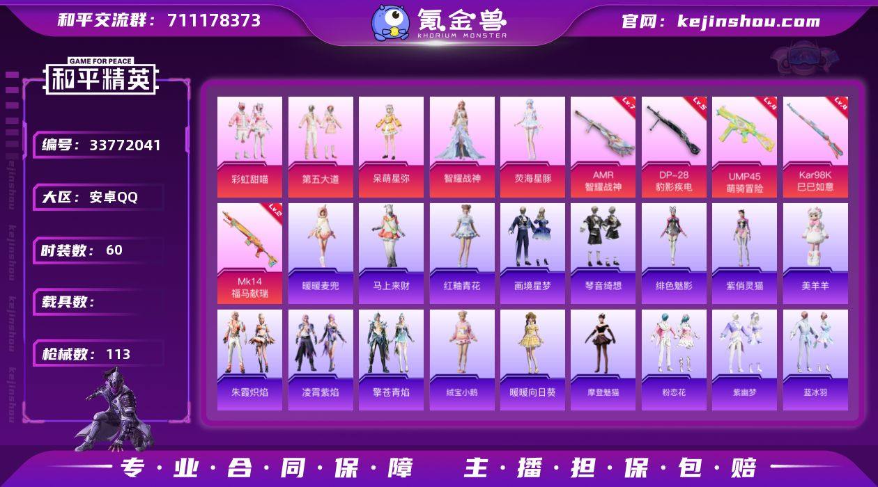 【8481】5粉装-5特效枪-0载具-1粉色飞行器-31460热力值-1王牌印记-60套装-113枪皮 【粉色套装】:粉装-彩虹甜喵,粉装-第五大道,角色-呆萌星弥,角色-智耀战神,角色-荧海星豚 【粉色枪皮等级】:UMP45-萌骑冒险(四级),Kar98K-巳巳如意(四级),Mk14-福马献瑞(二级),AMR-智耀战神(七级),DP-28-豹影疾电(五级)