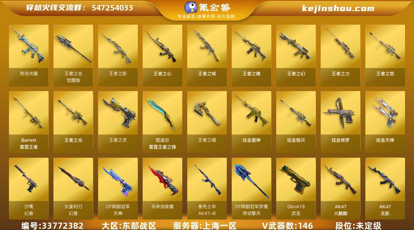 上海一区-166V-30王者武器数-12炫金武器数 【传说武器】:传说光耀 【热门武器】:传说光耀,G36C-幻影,QBZ03-金色蔷薇*2,Scar Light-白虎,HK417-朱雀,M4A1-青龙,M200-幻神,死亡之眼,Kar98K-星神,C.A.T,M4A1-黑骑士*8,汤姆逊-烈龙*8,RPK-盘龙*7,加特林-炼狱*2,斯泰尔-蝴蝶,降世魔童,火麒麟-绝迹,COP-白鲨,沙鹰-修罗*4,高爆手雷-幻兽 【王者炫金武器】:王者之城,王者之幻,王者之影*2,王者之魄,王者之心,王者之光*2,王者之怒,王者之力,Barrett-雷霆王者,王者之灵,王者之啸,雷霆王者之锋,高爆手雷-雷霆王者*2,炫金骑士,炫金雷神*2,炫金武士,炫金毁灭*5,炫金天神,炫金修罗*2 【音效卡】:AK47-火麒麟音效卡,M4A1-雷神音效卡,M4A1-黑龙音效卡,M4A1-黑骑士音效卡,Barrett-毁灭音效卡,Barrett-极光音效卡*2 【皮肤】:幻神-电流骇客 皮肤,雷神-暗月,雷神-荣耀之魄,雷神-虎将,雷神-耀金皮肤,雷神-冠军之魄,雷神-宇航兔皮肤,炼狱-玩具枪皮肤,火麒麟-雷神,火麒麟-冠军之心,AK47-火麒麟-传奇EVEN,火麒麟-心动糖果,毁灭-暗月,毁灭-荣耀之怒,毁灭耀金皮肤*2,毁灭-AG-CFPLS15冠军,毁灭-CFS2020,黑龙-能量核心,M4A1-黑龙-361,...