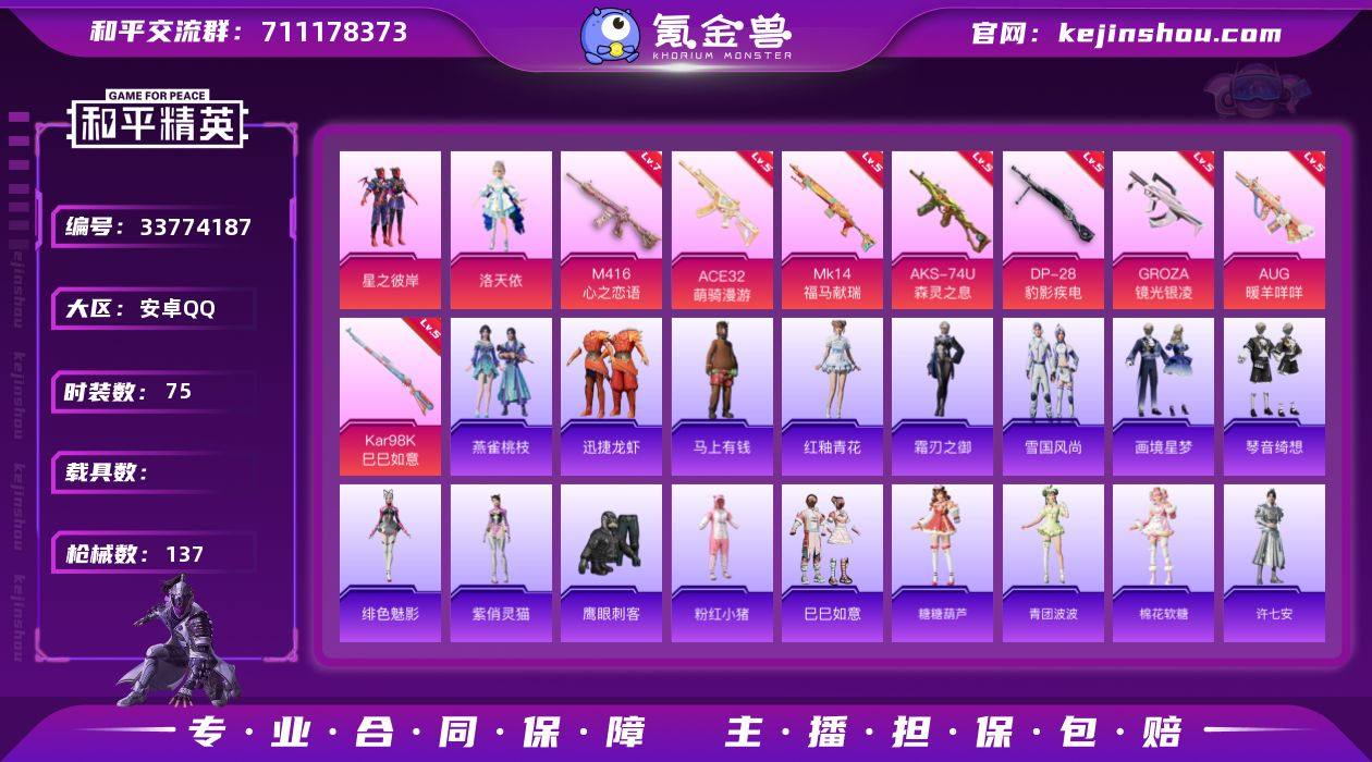 【kyhp1789】安卓 手Q-2粉装-8特效枪-0载具-1粉色飞行器-36514热力值-3王牌印记-75套装-137枪皮 【热门品类】:套装-粉红小猪 【粉色套装】:粉装-星之彼岸,角色-洛天依 【粉色枪皮等级】:M416-心之恋语(七级),GROZA-镜光银凌(五级),AUG-暖羊咩咩(五级),ACE32-萌骑漫游(五级),AKS-74U-森灵之息(五级),Kar98K-巳巳如意(五级),Mk14-福马献瑞(五级),DP-28-豹影疾电(五级) 【粉色枪皮】:M416-心之恋语,GROZA-镜光银凌,AUG-暖羊咩咩,ACE32-萌骑漫游,AKS-74U-森灵之息,Kar98K-巳巳如意,Mk14-福马献瑞,DP-28-豹影疾电 【粉色飞行器】:炫彩糖果飞行器 【粉色降落伞】:绝对恒星降落伞,精灵梦叶罗丽降落伞,临安公主降落伞,雪月幻音降落伞,异瞳寒姬降落伞,极意拳锋降落伞,炫彩糖果降落伞,罪夜之冕降落伞 【稀有套装】:套装-巳巳如意,套装-雪国风尚,套装-炫彩糖果,套装-马上有钱,套装-迅捷龙虾,套装-糖糖葫芦,套装-青团波波,套装-棉花软糖,角色-许七安,角色-怀庆长公主,套装-燕燕于飞,套装-鱼渊荷华,角色-蜜桃派对,套装-云朵鹅,套装-雪绒豹,角色-绛羽幽主,角色-绯色魅影,角色-紫俏灵猫,套装-画境星梦,套装-琴音绮想,角色-霜刃之御,套装-...
