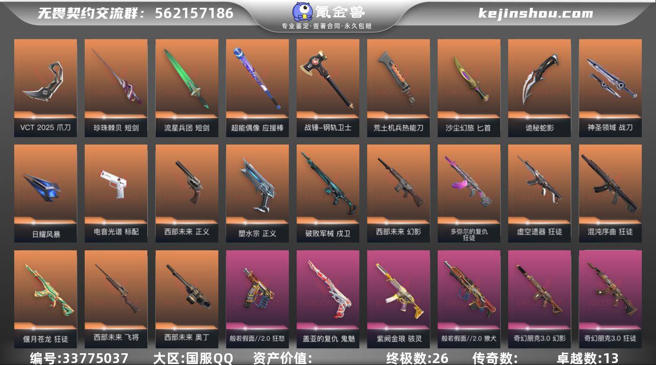 【套装】:VCT 2025 赛季套装,西部未来套装,般若假面//2.0套装 【英雄】:幻棱,炼狱,维斯,暮蝶,钛狐,壹决,铁臂,捷风,雷兹,幽影,不死鸟,贤者,猎枭,蝰蛇,零,芮娜,奇乐,尚勃勒,霓虹,斯凯,夜露,星礈,K/O,海神,盖可,黑梦,钢锁 【近战武器】:近战武器-魔术火花,近战武器-VCT 2025 爪刀,近战武器-威龙之刃,近战武器-鬼丸国纲,近战武器-源始幻刃,近战武器-未来开拓者,近战武器-珍珠棘贝 短剑,近战武器-流星兵团 短剑,近战武器-超能偶像 应援棒,近战武器-钢轨卫士 战锤,近战武器-荒土机兵 热能刀,近战武器-沙尘幻旅 匕首,近战武器-诡秘蛇影 军刀,近战武器-神圣领域 战刀,近战武器-日耀风暴 遗器,近战武器-魔术火花 【狂徒】:狂徒-混沌序曲,狂徒-偃月苍龙,狂徒-虚空遗器,狂徒-多弥尔的复仇,狂徒-般若假面//2.0,狂徒-掠影,狂徒-盖亚的复仇,狂徒-紫阙金琅,狂徒-离子武器//2.0,狂徒-奇幻朋克//3.0,狂徒-超能偶像,狂徒-钢轨卫士,狂徒-荒土机兵,狂徒-流星兵团,狂徒-沙尘幻旅,狂徒-诡秘蛇影 【幻影】:幻影-西部未来,幻影-奇幻朋克//3.0,幻影-珍珠棘贝,幻影-神圣领域,幻影-聚合之力,幻影-纳米打击,幻影-战术小伙伴,幻影-...