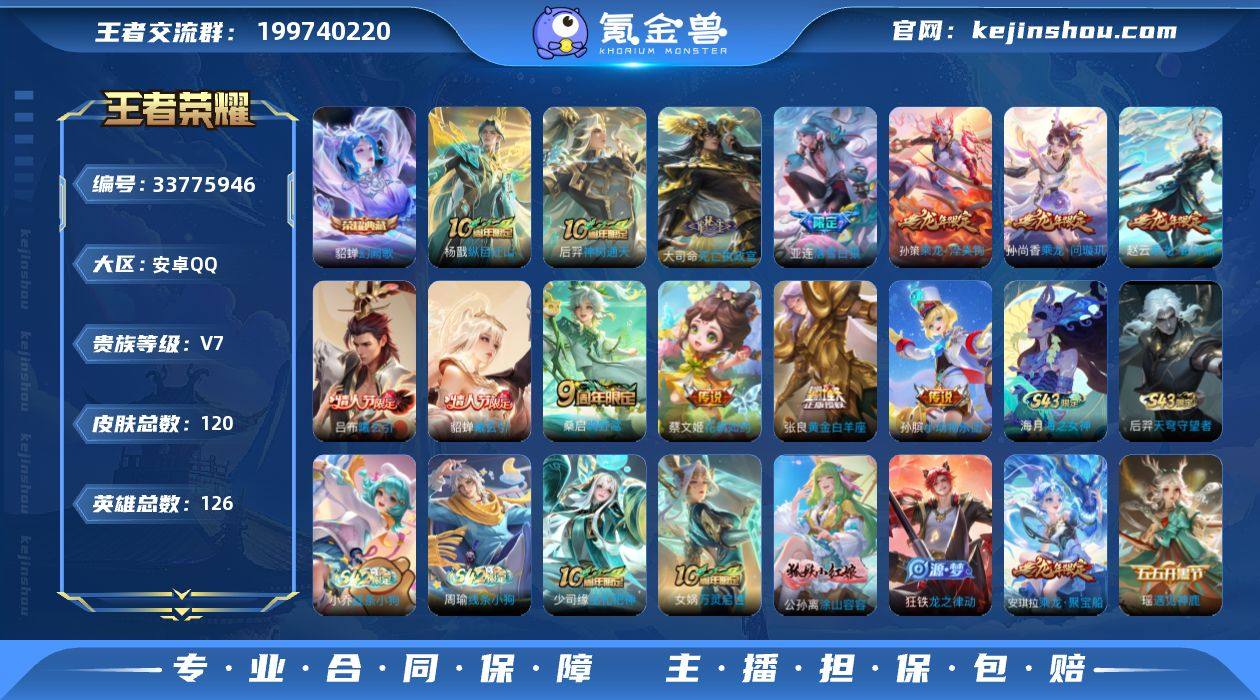 【V7极品对抗路打野号·貂蝉幻阙歌·杨戬纵目迁山·金标9650孙策·13传说·120皮肤·低价出】安卓Q-V7-至尊星耀III段位-126英雄-120皮肤-1典藏皮肤-13传说-41史诗 【荣耀典藏】:貂蝉幻阙歌 【传说皮肤】:杨戬纵目迁山,后羿神树通天,大司命死亡执政官,桑启鸣野蒿,亚连落雪白狼,吕布曦玄引,貂蝉曦玄引,孙尚香乘龙问璇玑,孙策乘龙淬吴钩,赵云乘龙铭钟鼎,孙膑小动物乐团,蔡文姬花朝如约,张良黄金白羊座 【限定皮肤】:狄仁杰阴阳师,赵云皇家上将,狄仁杰魔术师,项羽海滩派对,沈梦溪大漠名商,沈梦溪匿光破解者,裴擒虎擒涛扼浪,嫦娥拒霜思,鲁班大师探海日志,桑启海盐诗旅,艾琳女武神,阿古朵江河有灵,张良古海寻踪,蒙犽百解令,高渐离燃音魔法,妲己灵卜魔法,鬼谷子天穹祈灯,伽罗琥珀纪元,大乔乘龙忆丹青,安琪拉乘龙聚宝船,孙尚香乘龙问璇玑,孙策乘龙淬吴钩,赵云乘龙铭钟鼎,吕布曦玄引,貂蝉曦玄引,百里玄策超元猎域,亚连落雪白狼,鲁班七号蔬乡物语,李元芳蔬乡物语,刘邦剑破天穹,程咬金群星魔术团 【年限皮肤】:孙尚香乘龙问璇玑,孙策乘龙淬吴钩,赵云乘龙铭钟鼎,大乔乘龙忆丹青,安琪拉乘龙聚宝船 【赛季限定】:沈梦溪大漠名商,桑启海盐诗旅...